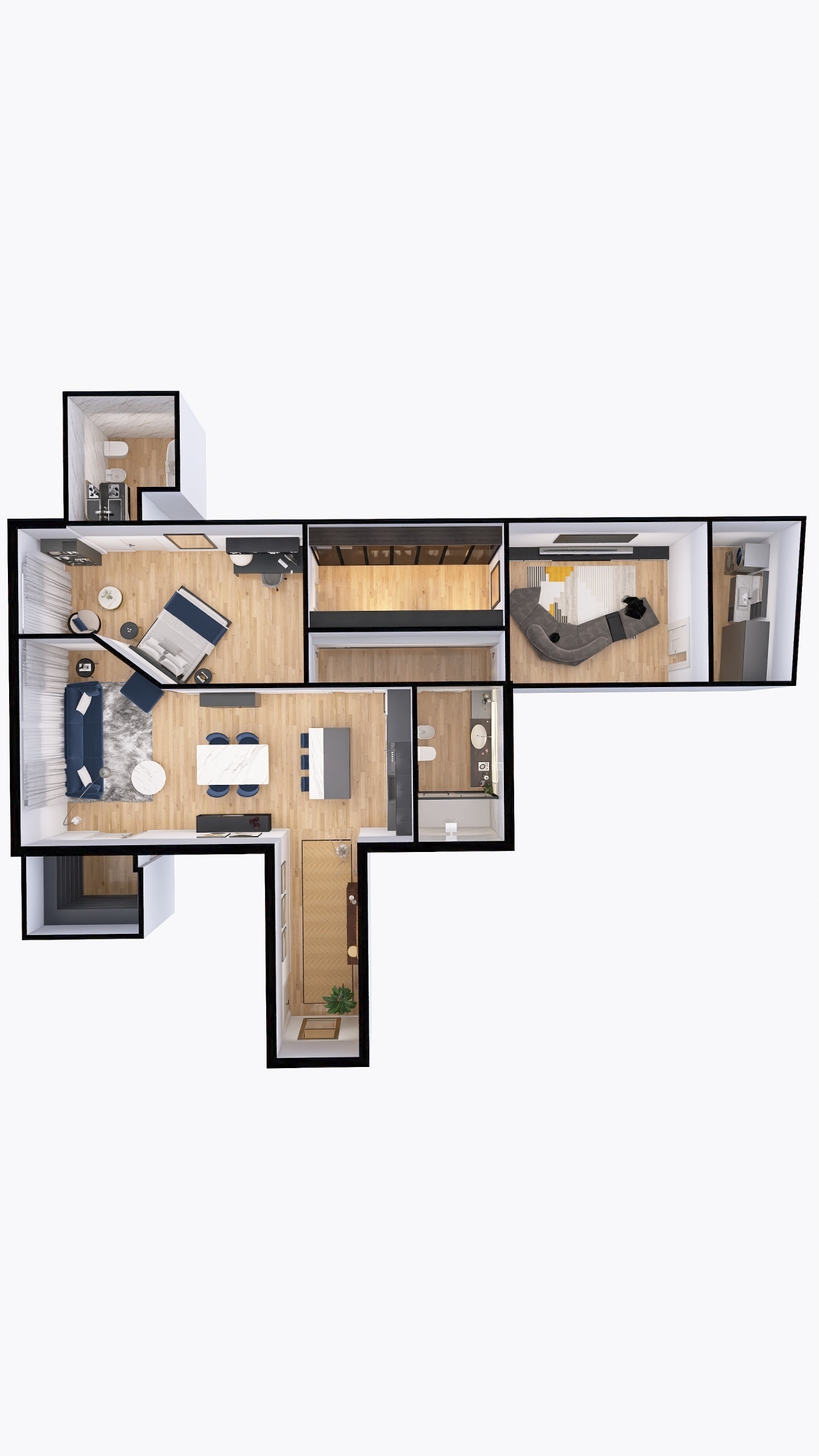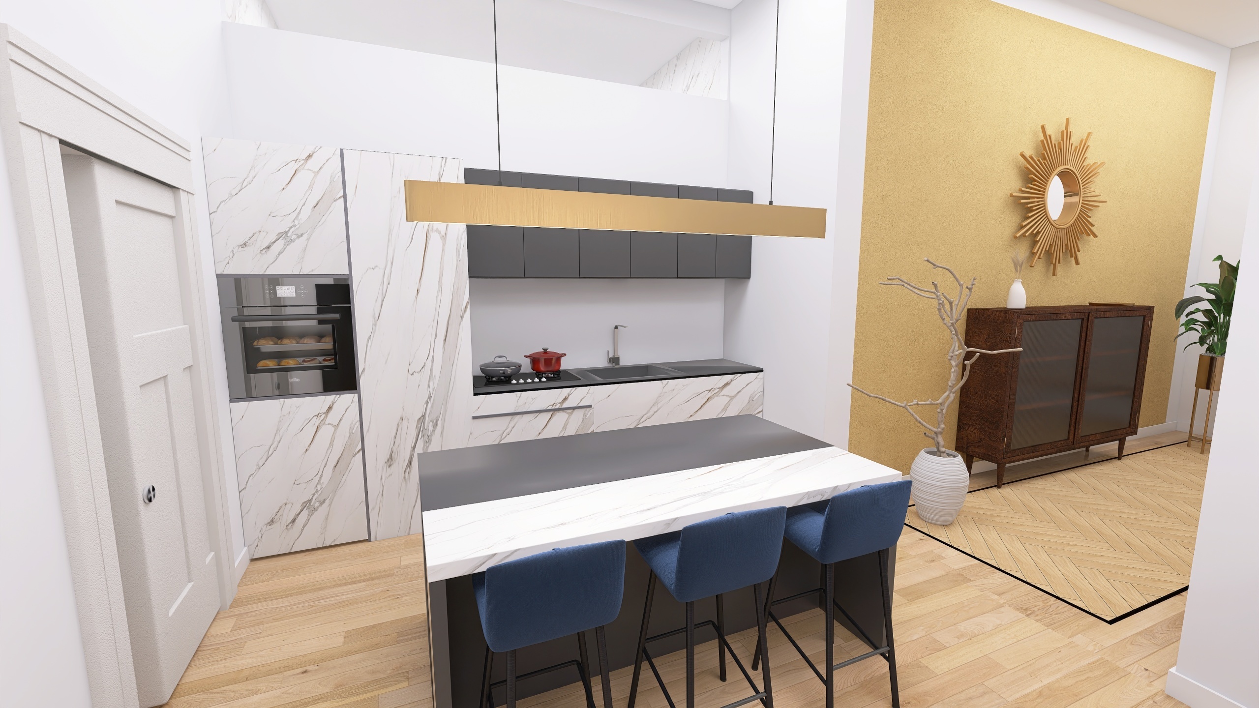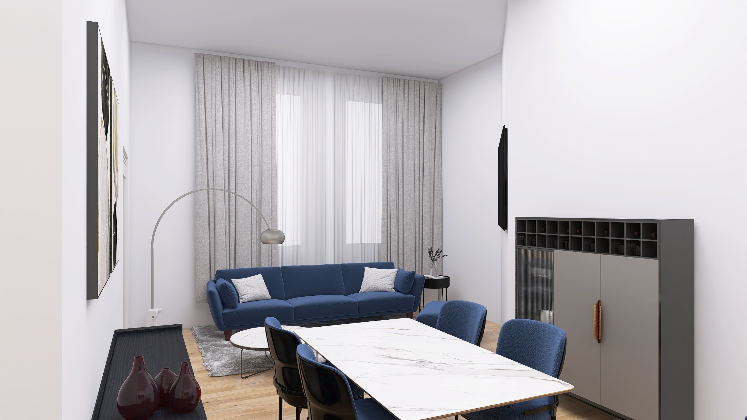 Si compone di: un ingresso arredabile con elegante parquet posato allitaliana, che conduce al luminoso soggiorno con angolo cottura, pensato per ospitare una comoda cucina con isola, un elegante tavolo da pranzo, una zona divani e un utile ripostiglio/dispensa separato.