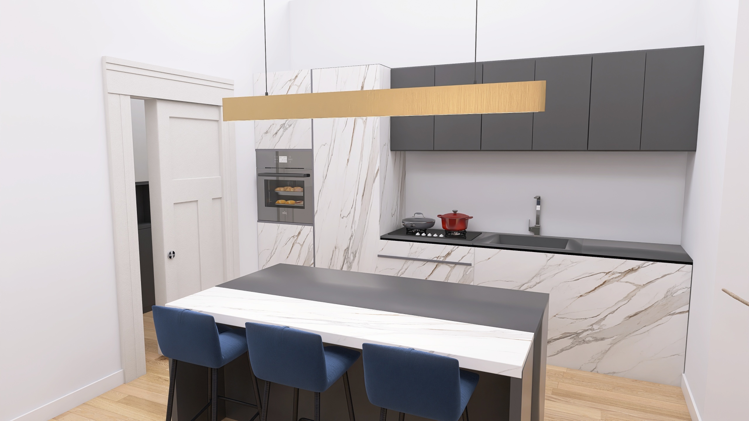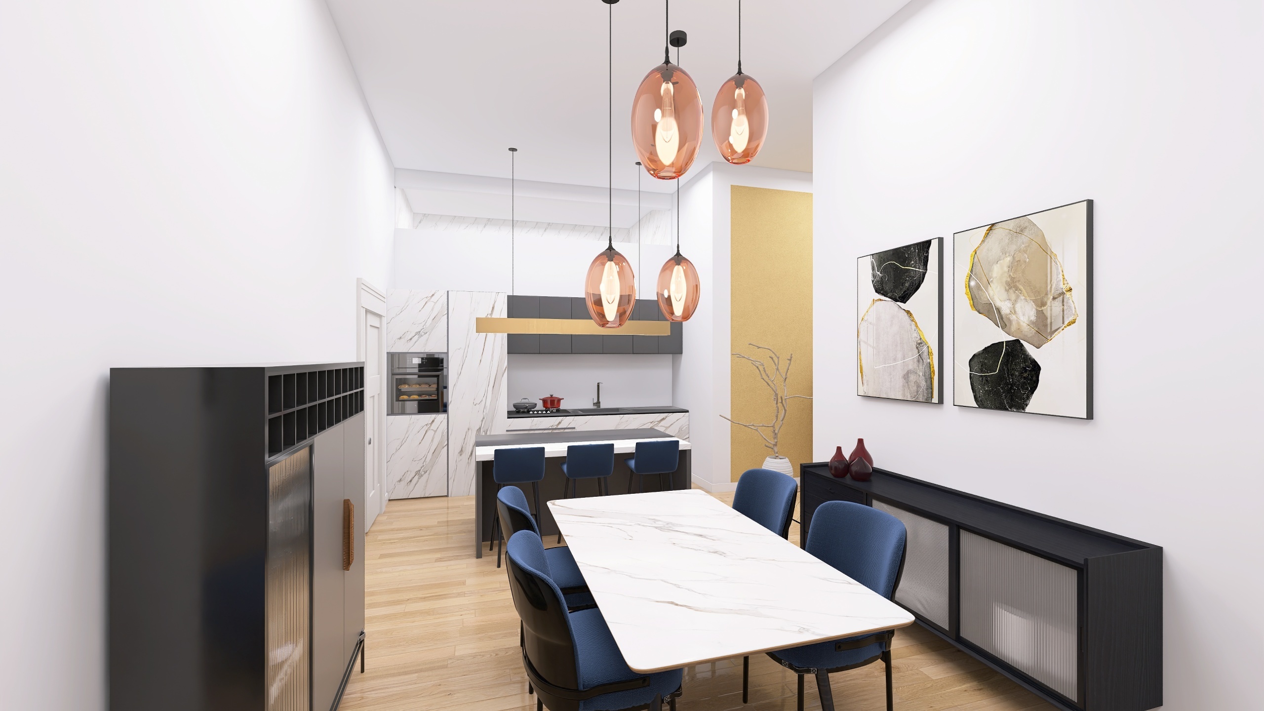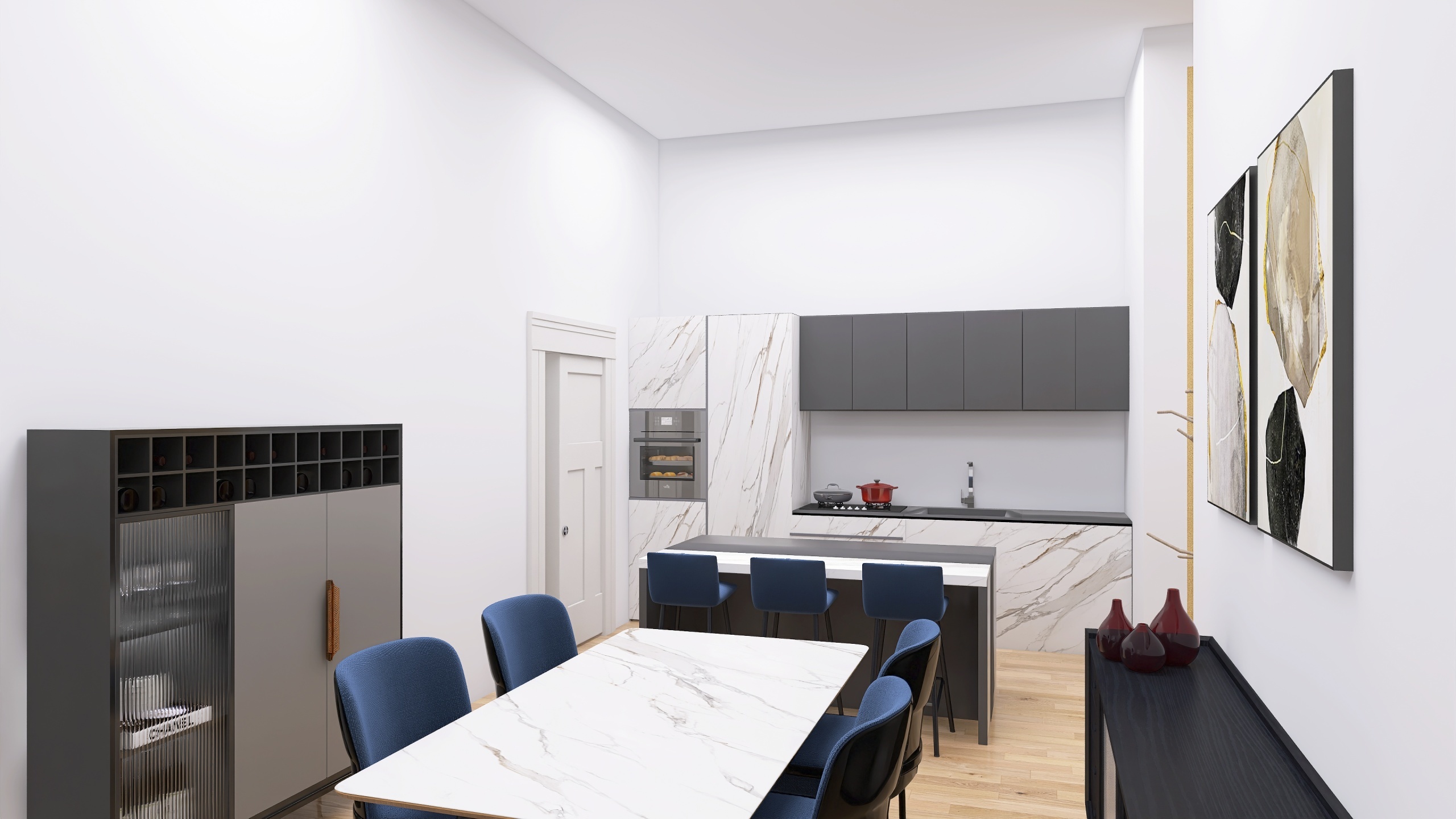 Si compone di: un ingresso arredabile con elegante parquet posato allitaliana, che conduce al luminoso soggiorno con angolo cottura, pensato per ospitare una comoda cucina con isola, un elegante tavolo da pranzo, una zona divani e un utile ripostiglio/dispensa separato.