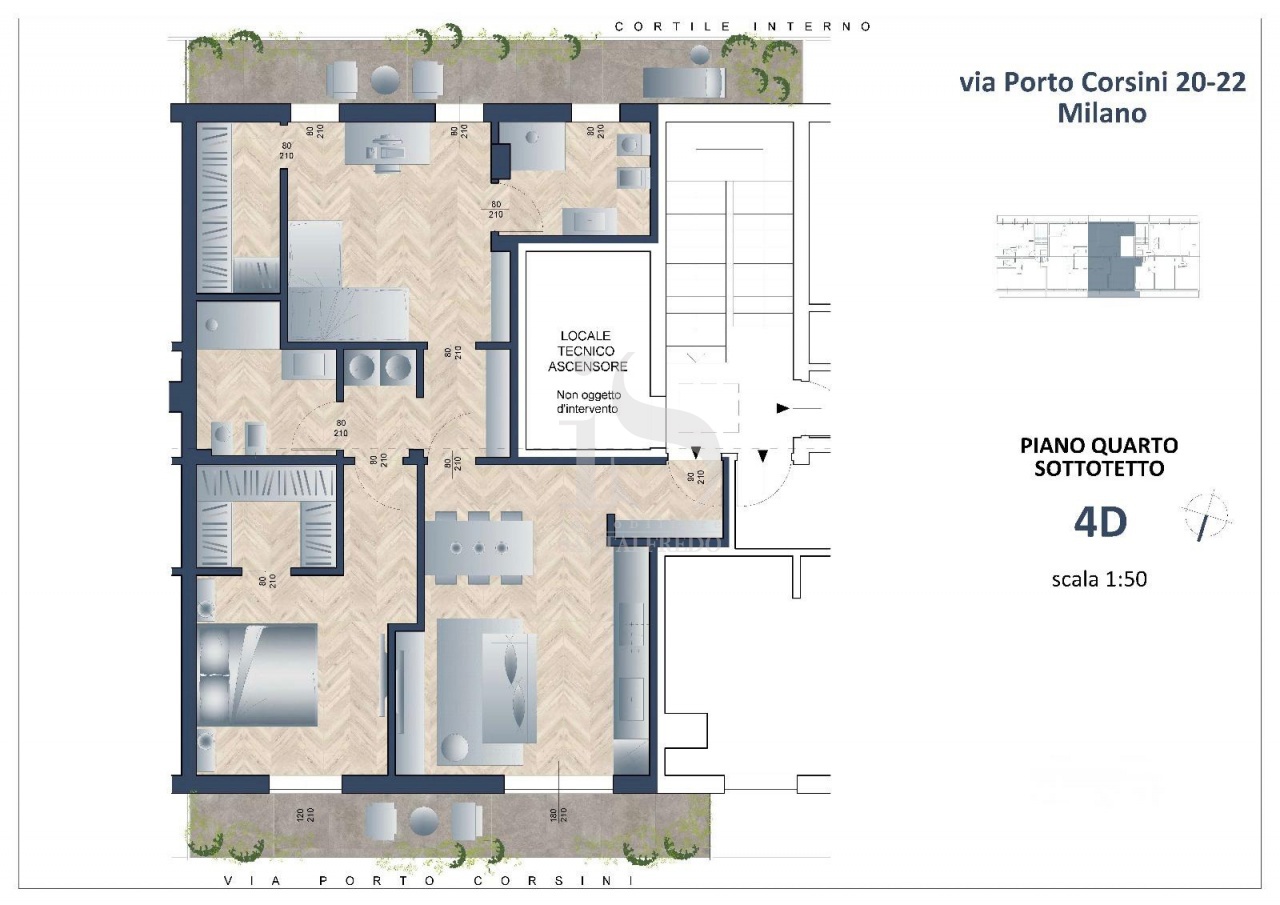 Nuova costruzione, Trilocale, doppia esposizione (Sud- Est verso il cortile interno / Nord-Ovest su Via Porto Corsini) al quarto e ultimo piano, inserito nella nuova soprelevazione ad alte prestazioni che consente all'intero intervento di raggiungere la classe energetica A. La distribuzione ruota attorno alla zona giorno, soggiorno e cucina, un ambiente regolare che si affaccia sulla balconata continua rivolta a nord-ovest, pavimentata con gres strutturato antiscivolo R11. La zona notte comprende due camere, entrambe valorizzate da una cabina armadio, oltre bagno in camera per quella matrimoniale, proseguendo, secondo bagno collocato in posizione di servizio alla casa con sanitari Hatria Bianca, rubinetteria Ideal Standard Ceraline, piatto doccia in resina effetto pietra e scalda salviette Zehnder.