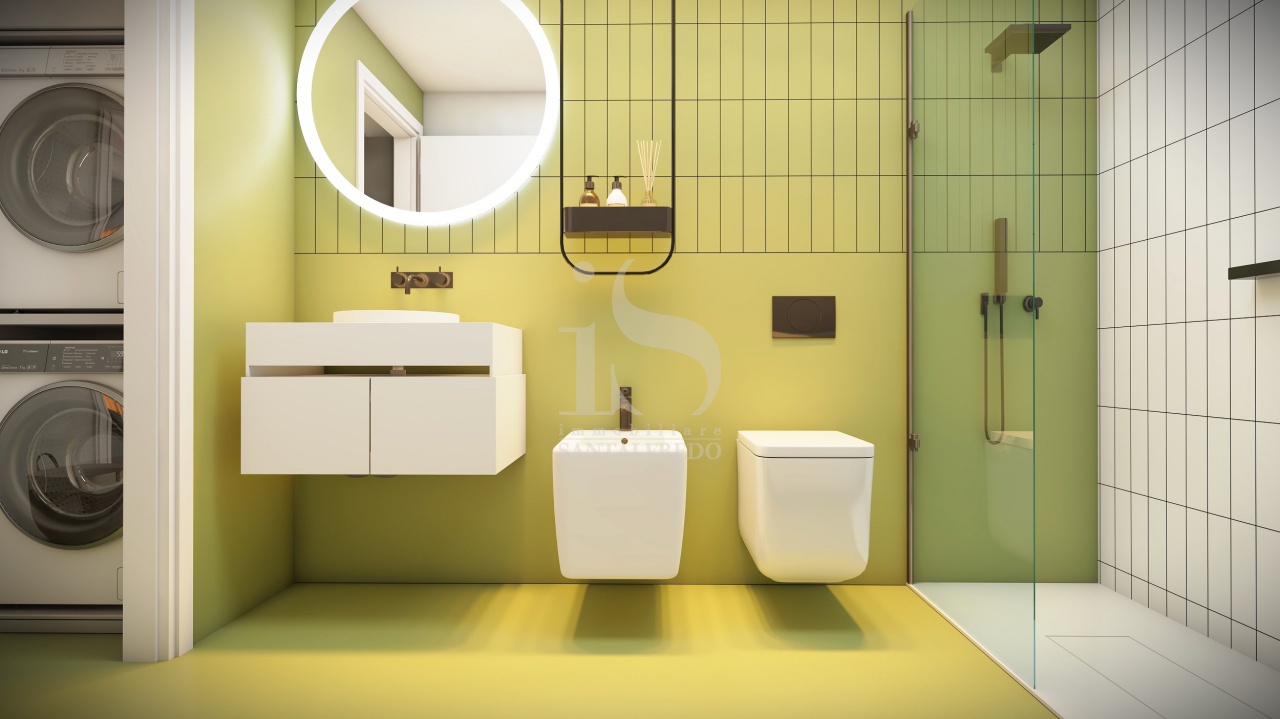 La planimetria prevede inoltre un locale dedicato all'alloggiamento di lavatrice e asciugatrice, integrato in modo funzionale nel layout dell'appartamento.
