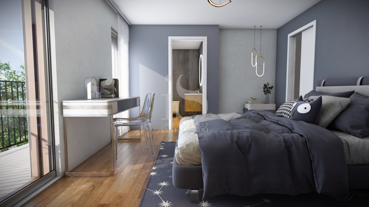 La distribuzione interna ruota attorno alla zona giorno con soggiorno e cucina, ambiente regolare e ben proporzionato, con affaccio diretto sul balcone continuo esposto a Nord-Ovest, pavimentato in gres strutturato antiscivolo.