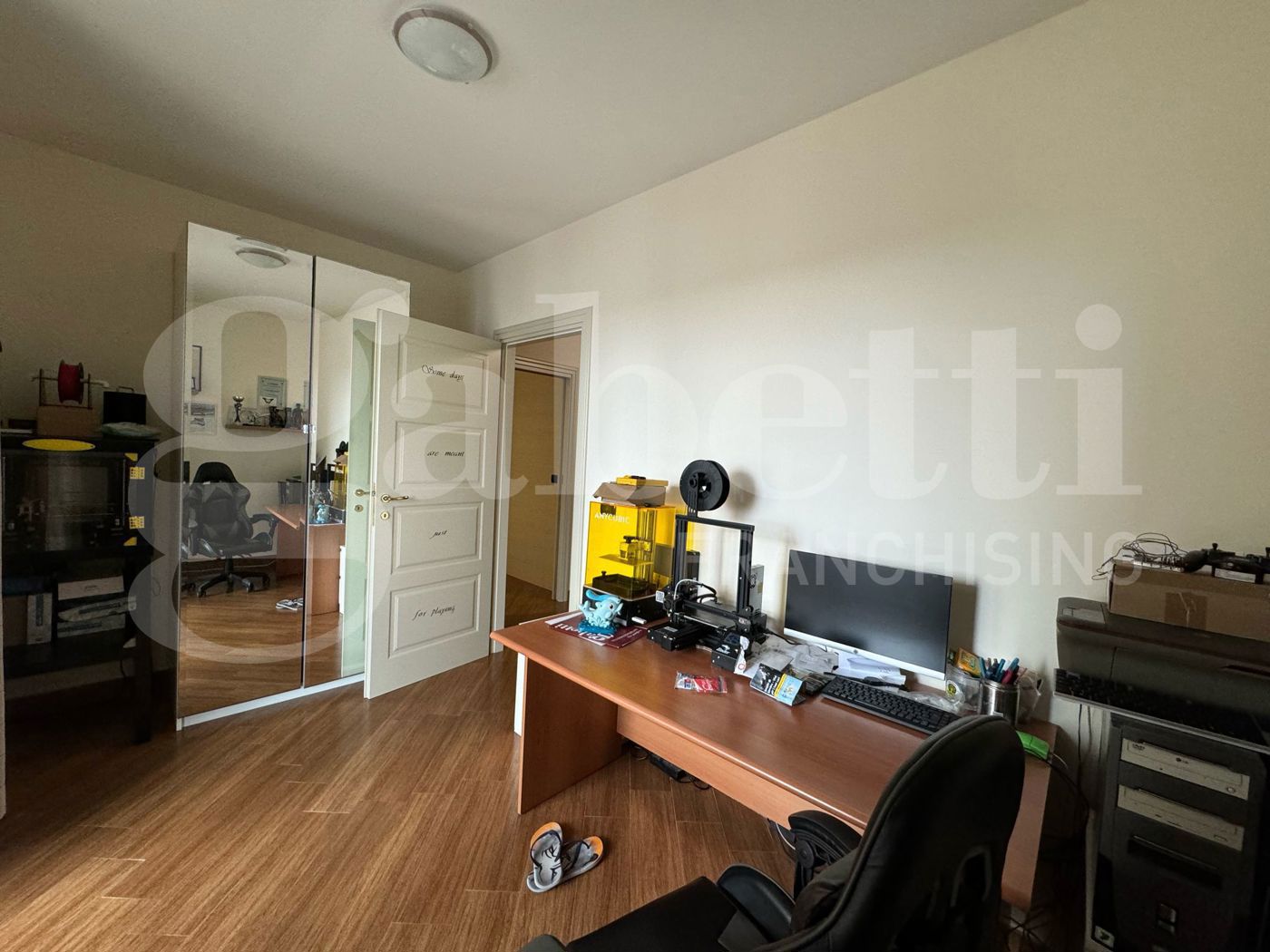 Lappartamento dispone inoltre di uno studio, ideale per chi lavora da casa, un ampio disimpegno che offre lo spazio perfetto per un pratico armadio a muro, due camere da letto confortevoli e due bagni, di cui uno in camera.