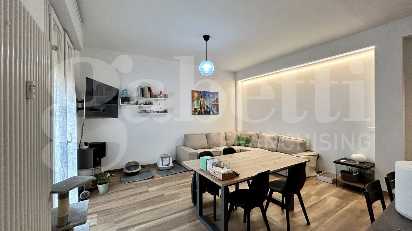 composto da un ampio soggiorno living con cucina a vista Scavolini (installata nel 2024 e inclusa nella vendita), ideale per chi cerca un ambiente moderno e funzionale.