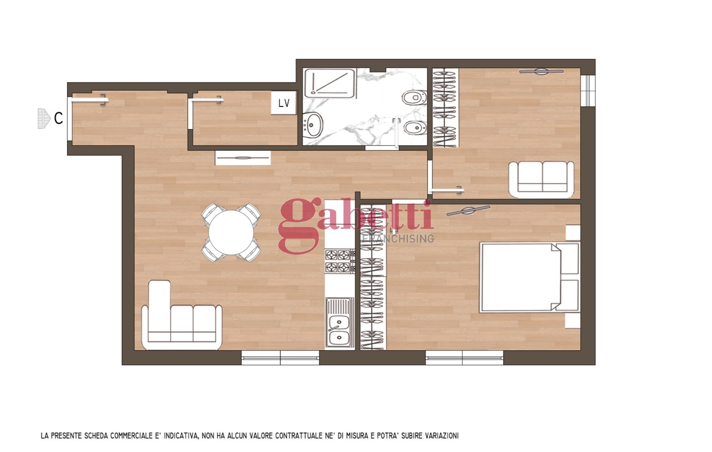 L'immobile risulta composto da un zona giorno con angolo cottura, una camera matrimoniale e un altro ambiente da utilizzare come studio o cameretta, inoltre un servizio dotato di aspirazione forzata e una lavanderia.
