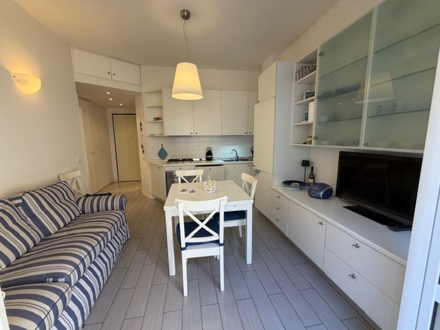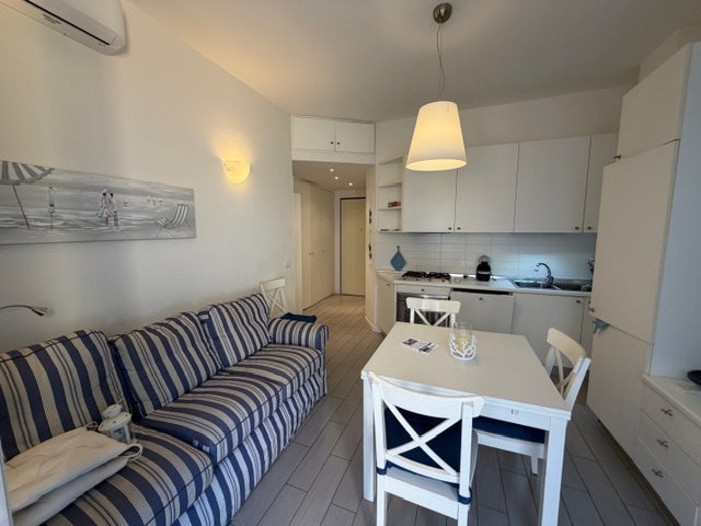 Composizione: Ingresso su disimpegno Antibagno e bagno con box doccia Luminoso soggiorno con angolo cottura Ampia balconata Corridoio Camera matrimoniale con accesso al balcone Cameretta/studio Caratteristiche: Completamente arredato Dotato di aria condizionata Ottimo stato interno Soluzione ideale sia come prima casa che come casa vacanze.