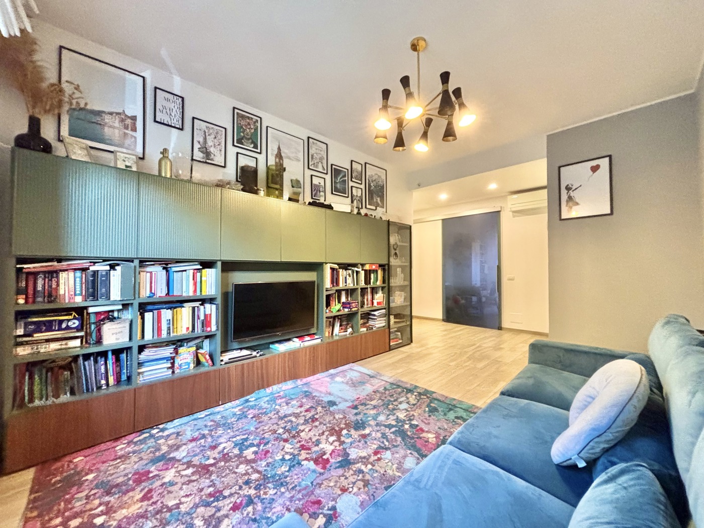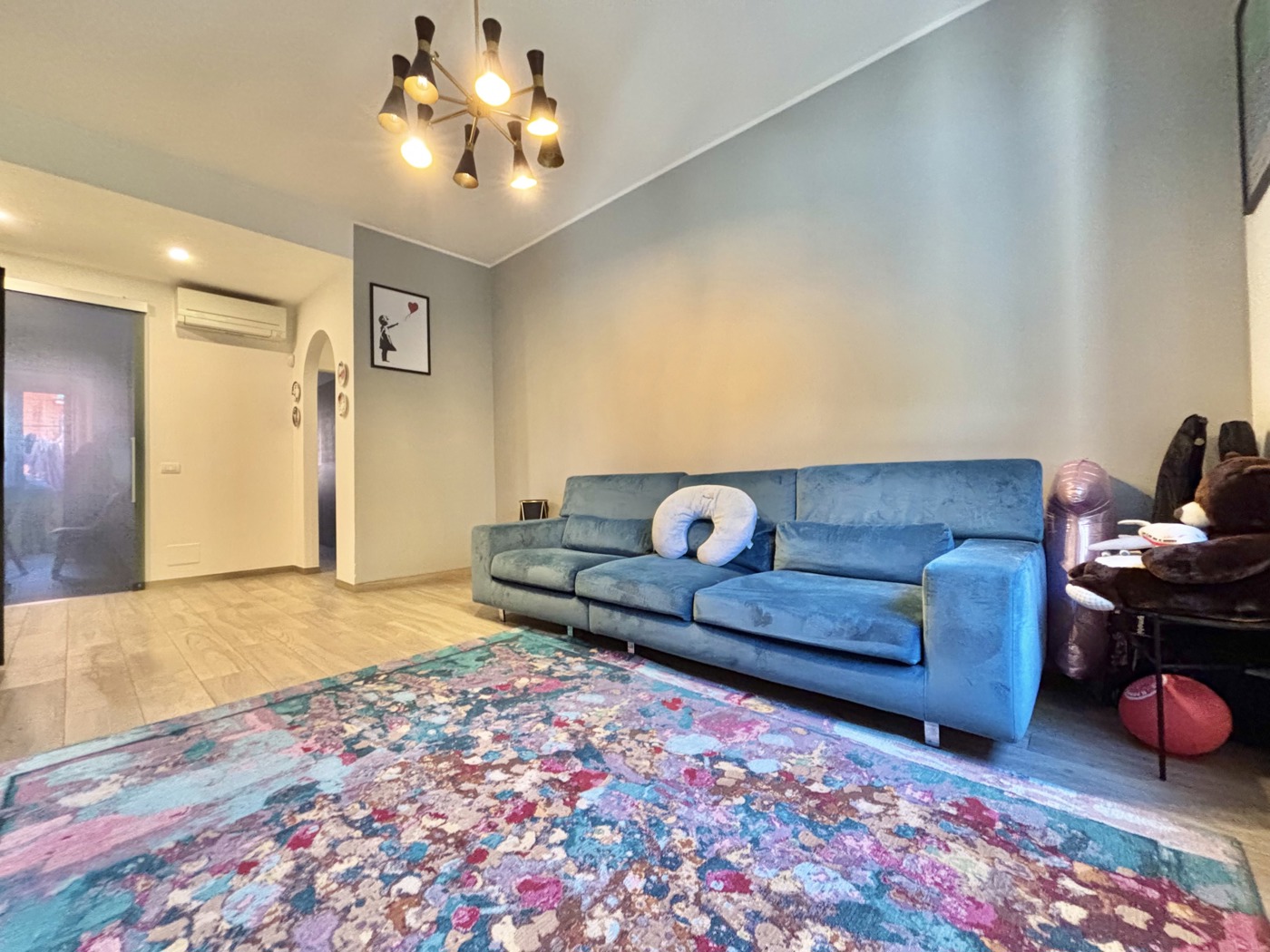 Per quanto riguarda le finiture dell'appartamento, la pavimentazione omogenea in tutte le stanze, ad eccezione del bagno, dove sono state utilizzate piastrelle in ceramica di design che conferiscono un tocco di eleganza.