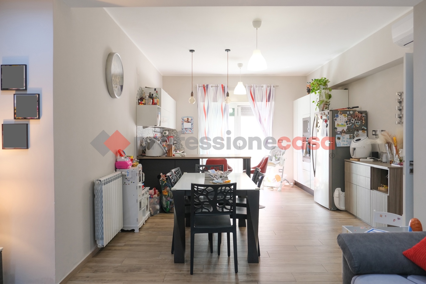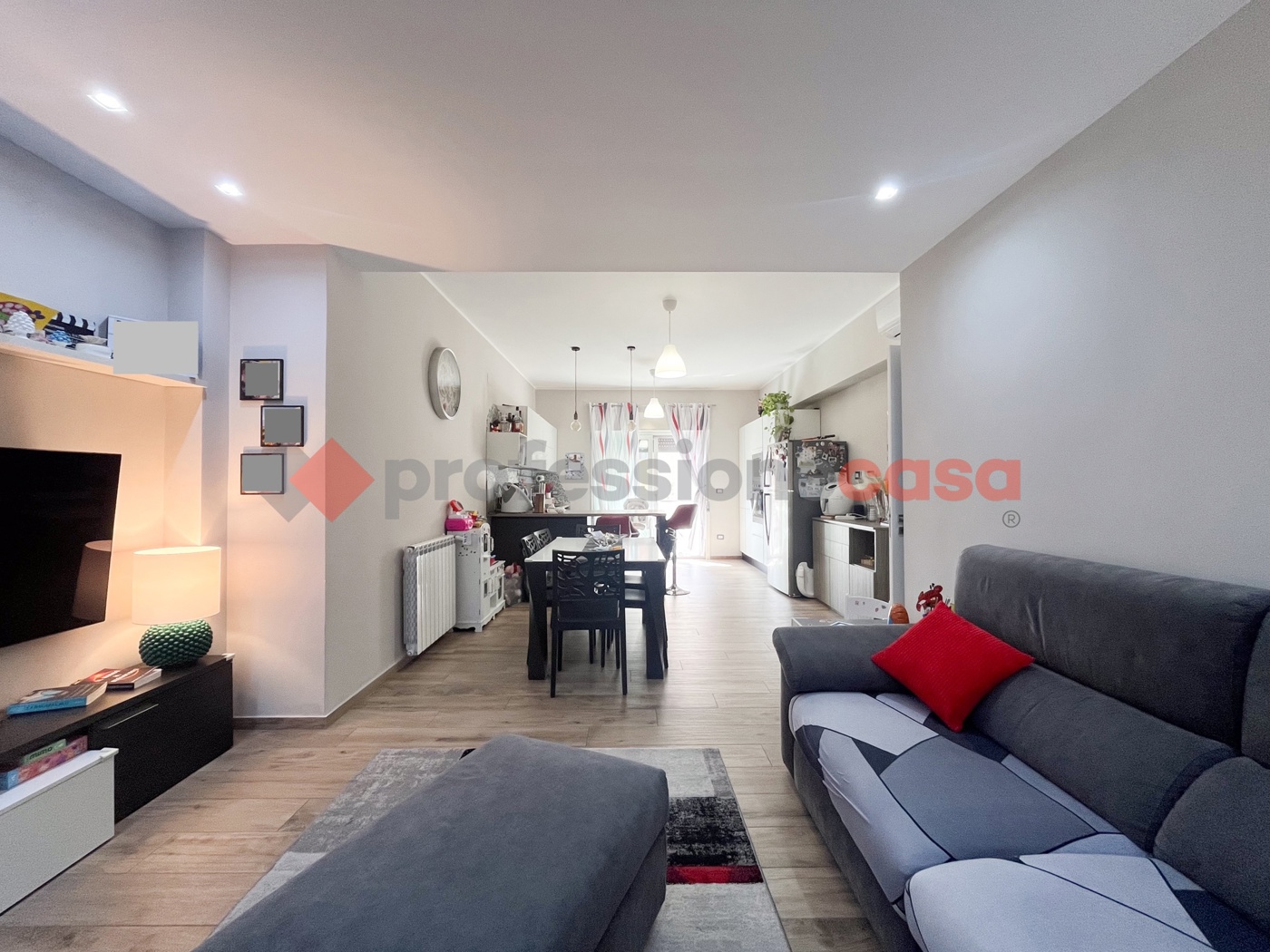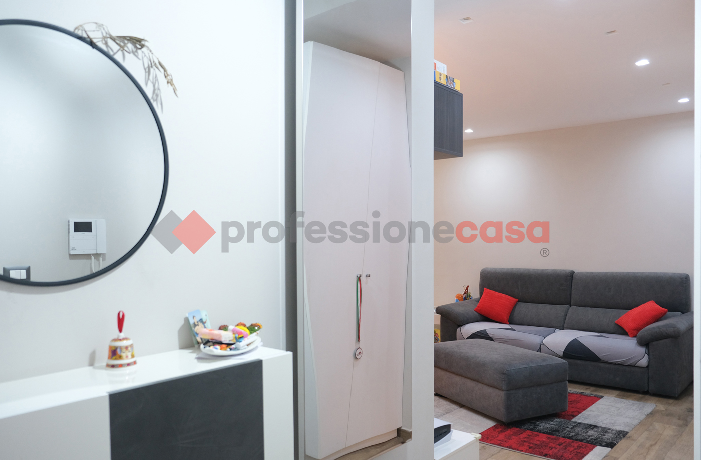 Limmobile si apre su un accogliente disimpegno, da cui si accede a una luminosa zona living con cucina a vista moderna e funzionale.
