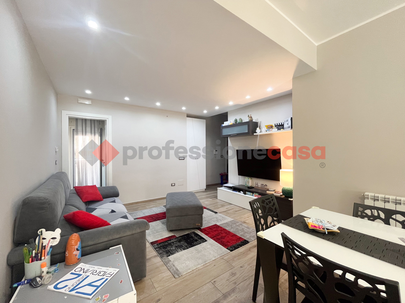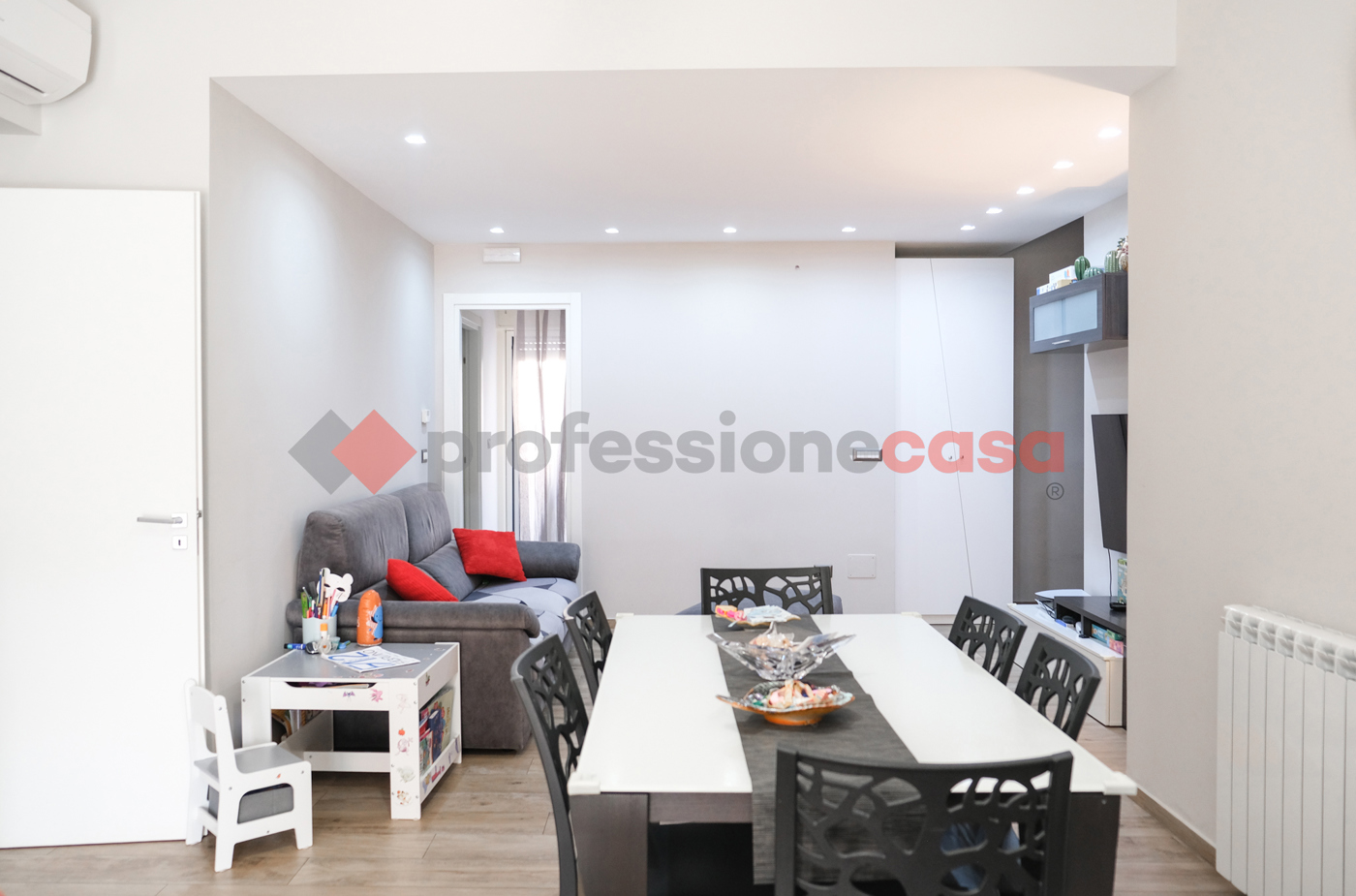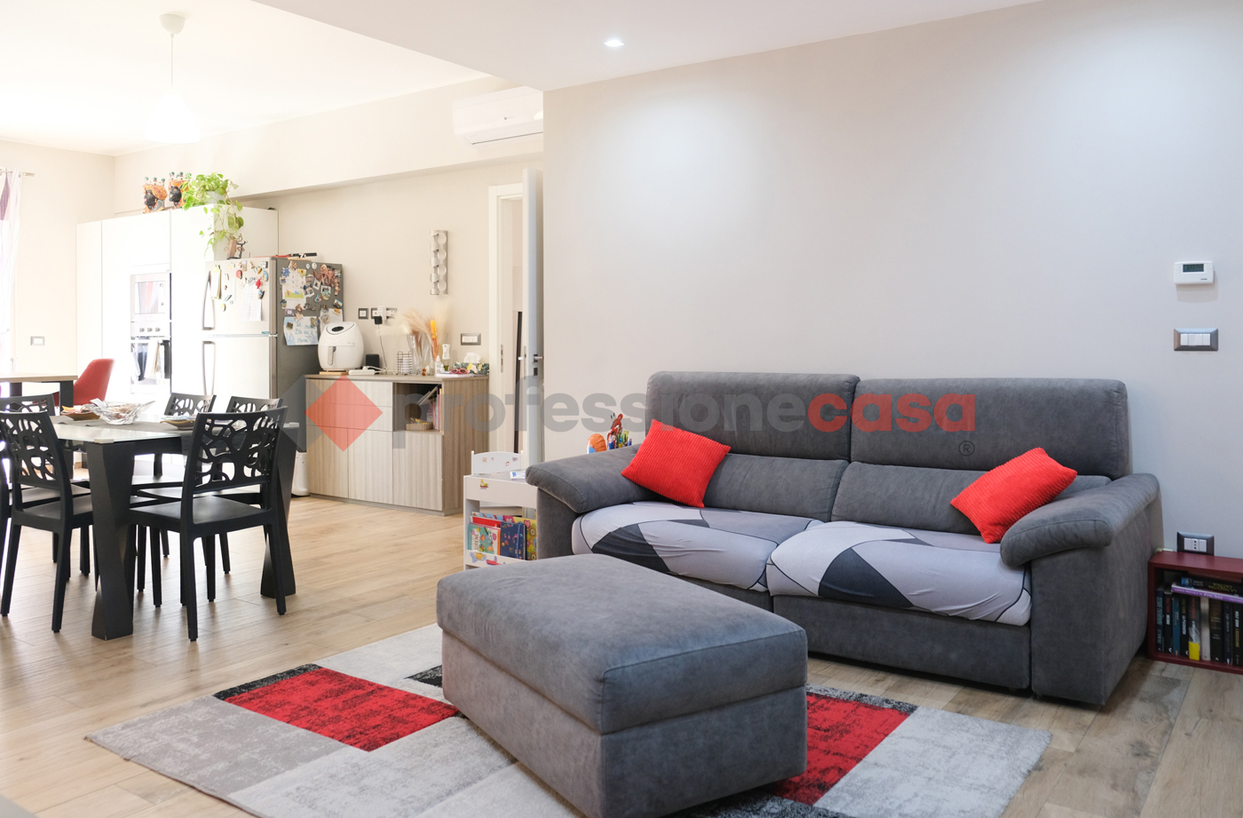 Limmobile si apre su un accogliente disimpegno, da cui si accede a una luminosa zona living con cucina a vista moderna e funzionale.