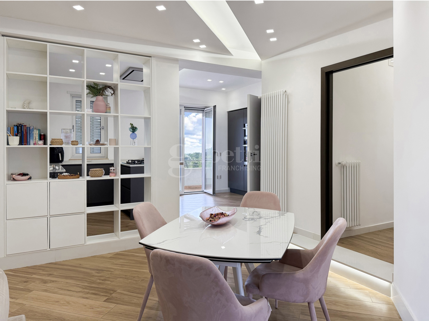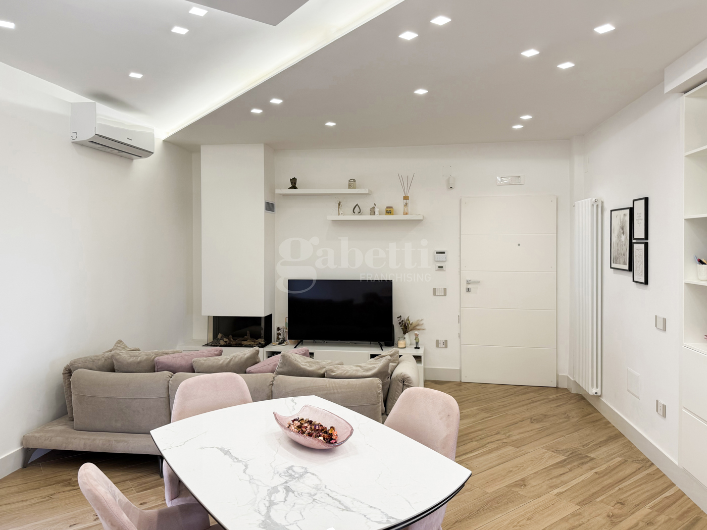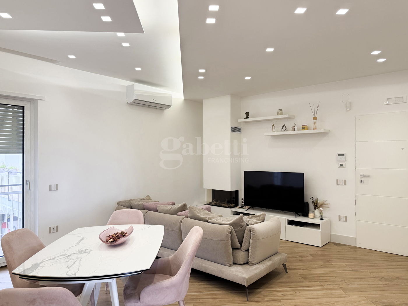 Lambiente impreziosito da un camino a bioetanolo, che dona calore e atmosfera, ed in perfetta continuit con una cucina moderna con penisola, ideale per momenti di convivialit e vita quotidiana.