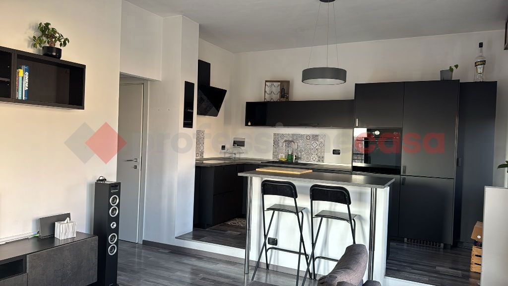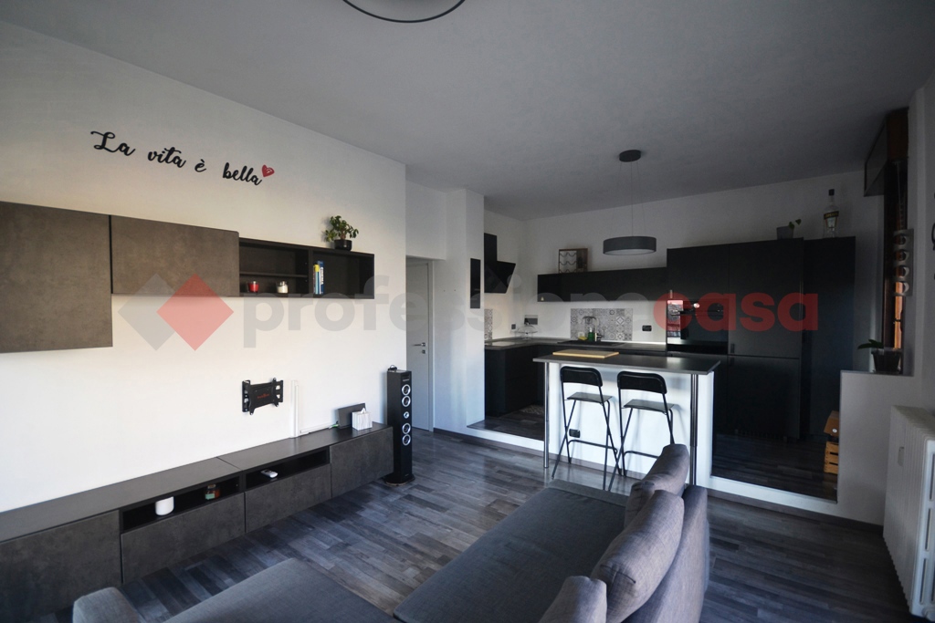 Lingresso accompagna verso un ampio soggiorno con cucina a vista, elegante e accogliente, con doppio accesso a un introvabile terrazzo.