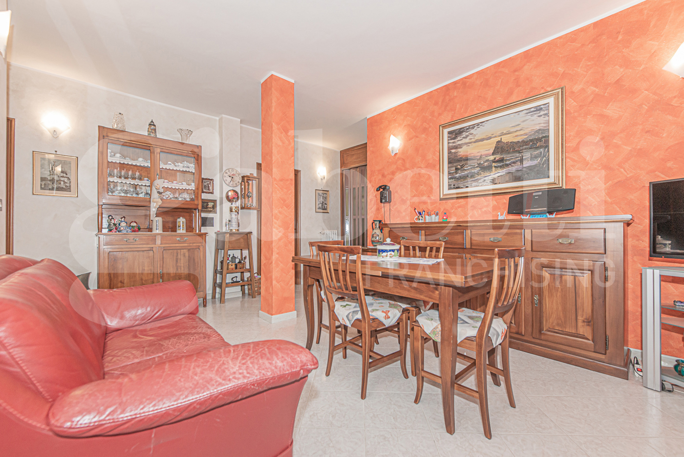 L'ingresso conduce al soggiorno climatizzato, separato da un angolo cottura moderno e funzionale.