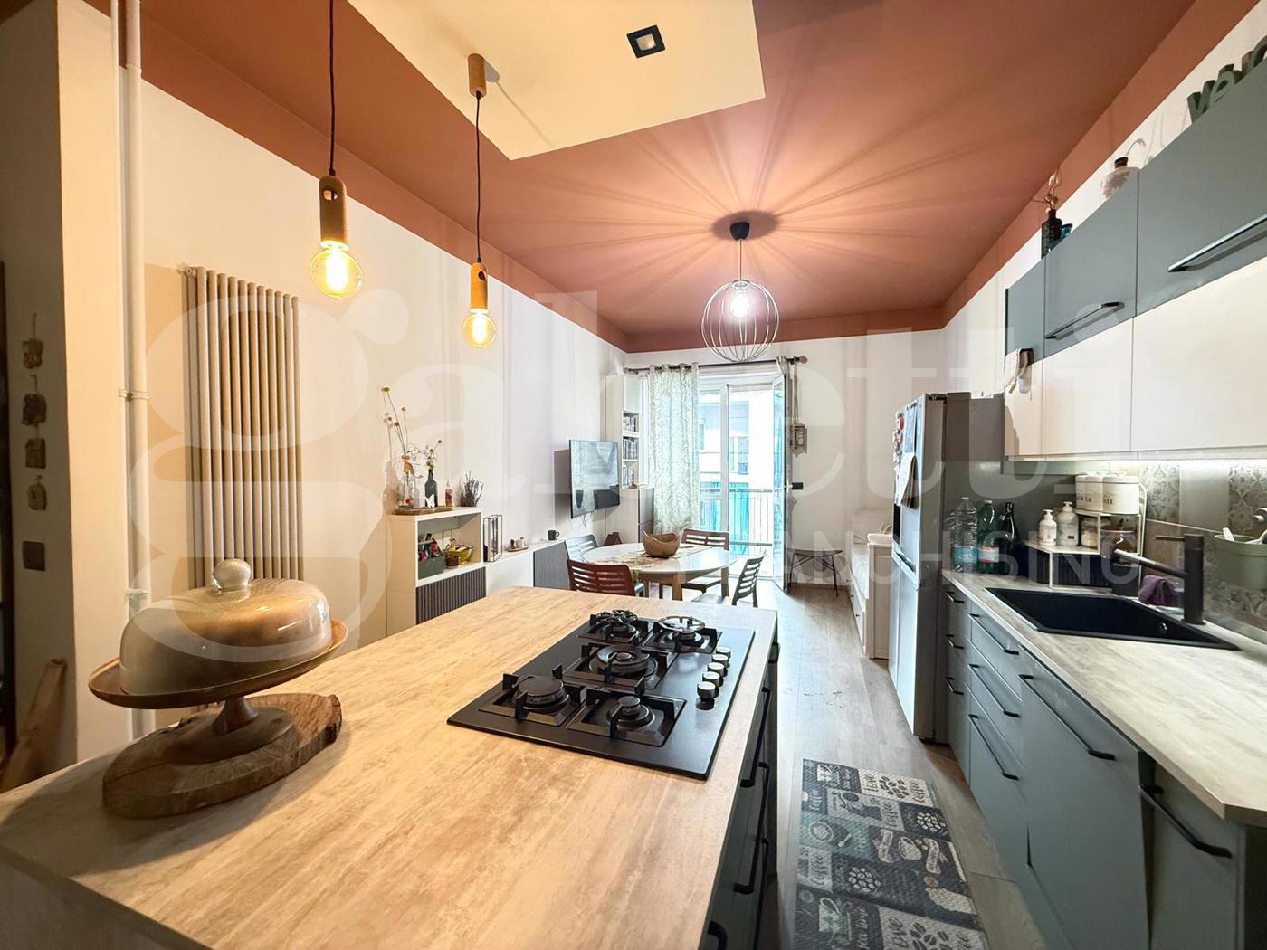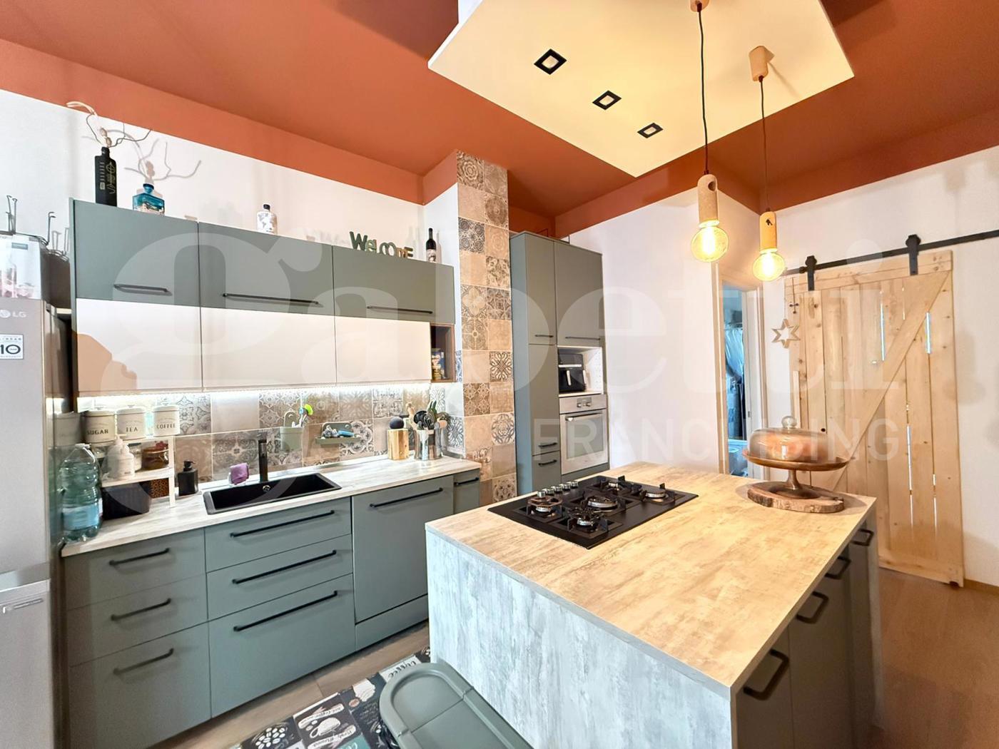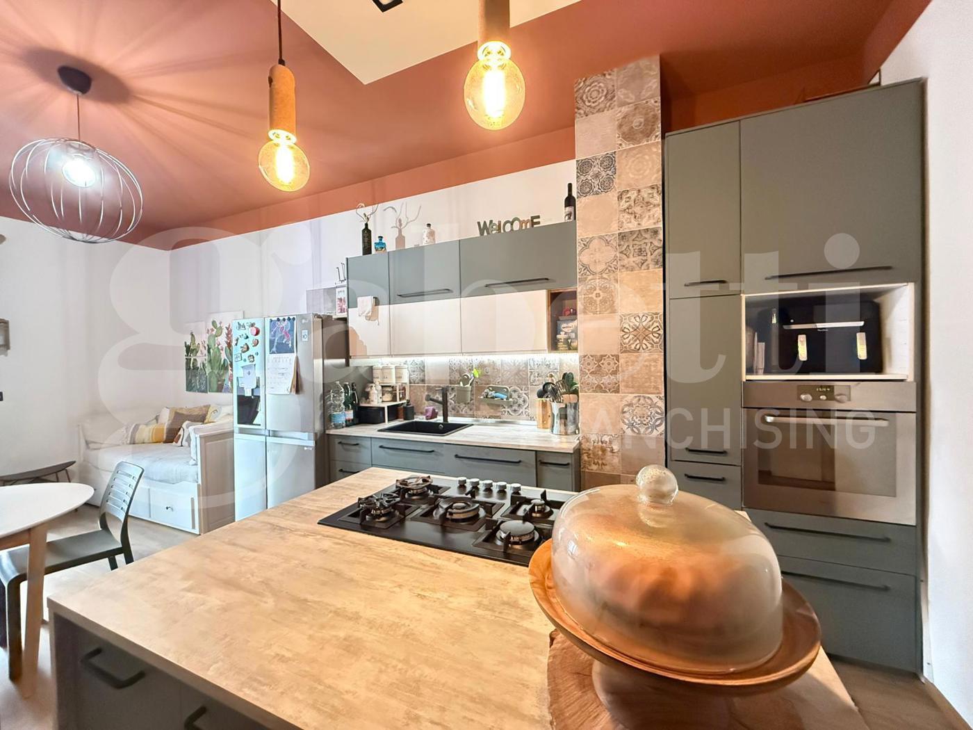 Lingresso conduce a un pratico disimpegno che accompagna alla zona giorno, caratterizzata da un moderno soggiorno con parete cottura a vista e isola allamericana, uno spazio conviviale pensato per la vita quotidiana e per accogliere amici e familiari, da cui si accede al primo balcone.