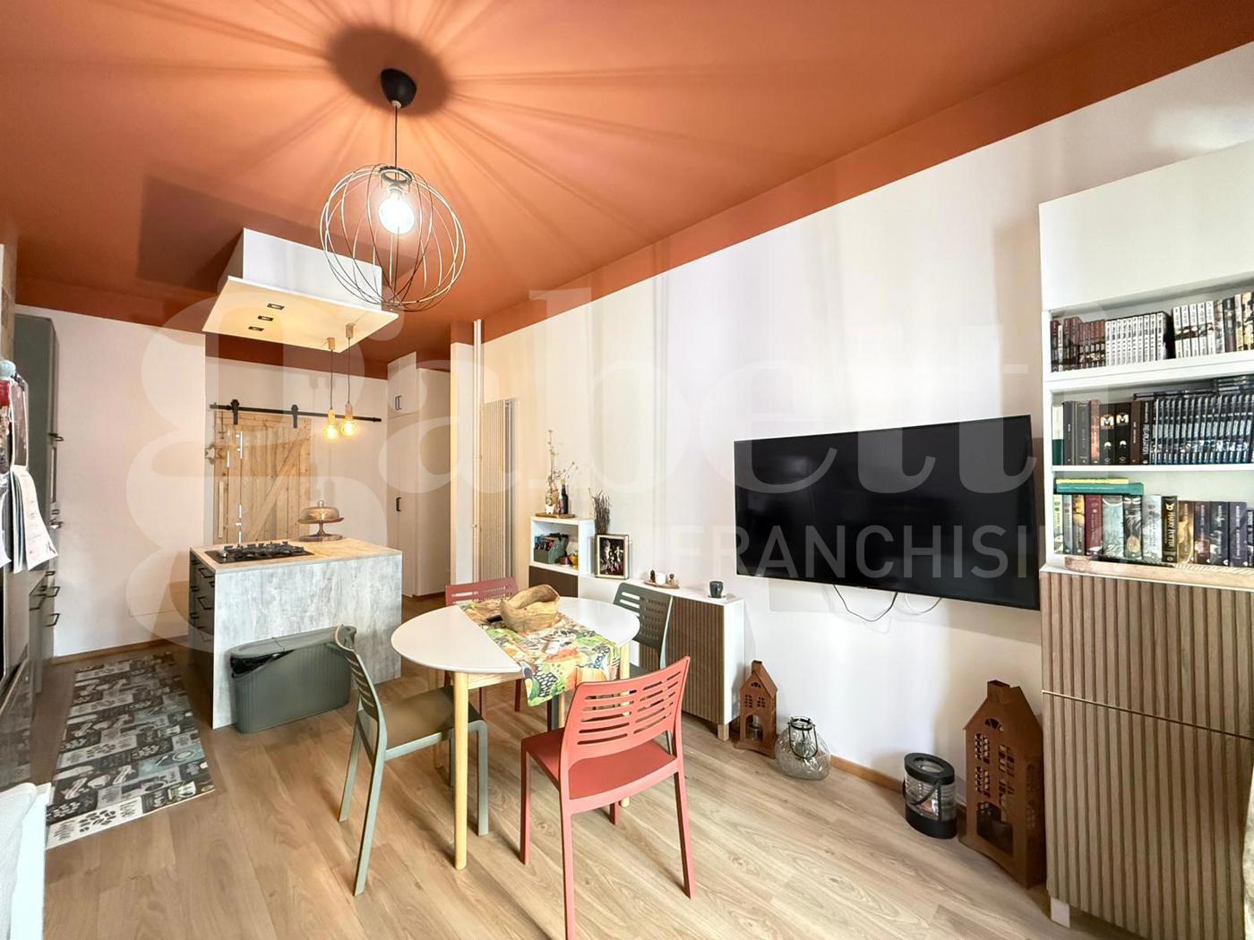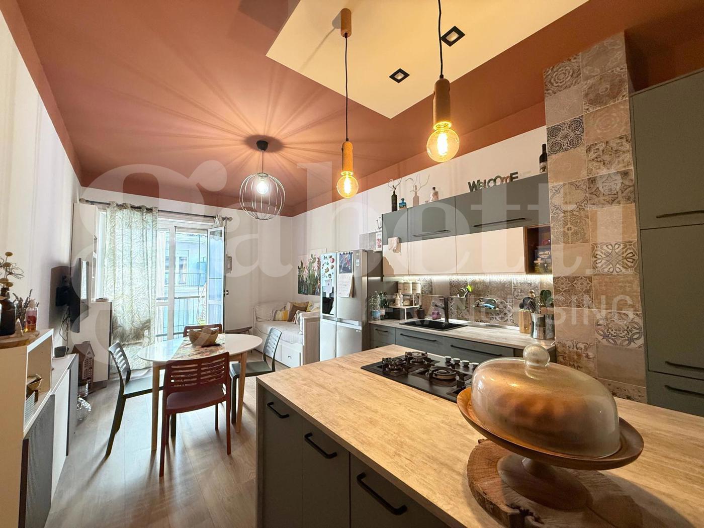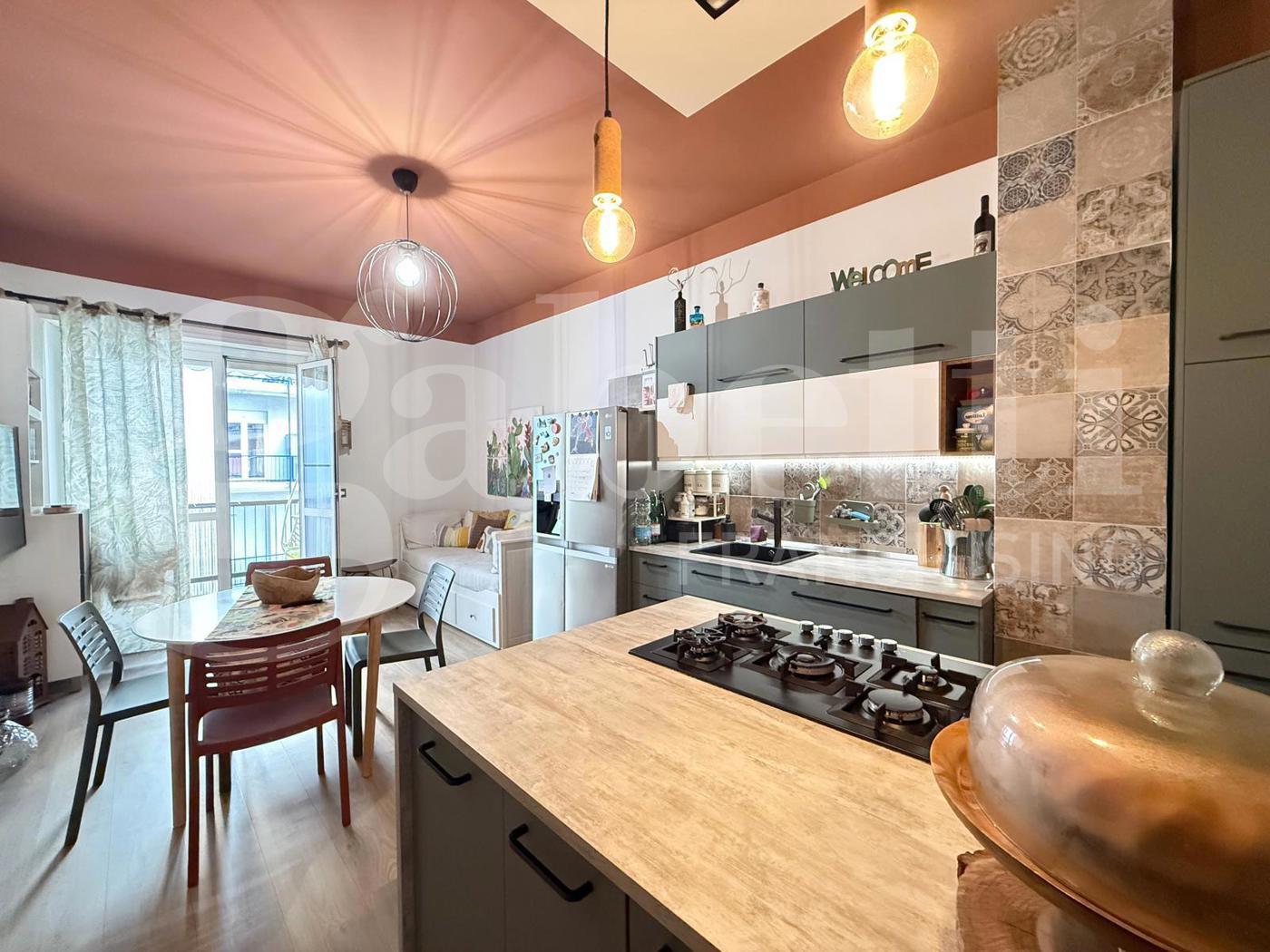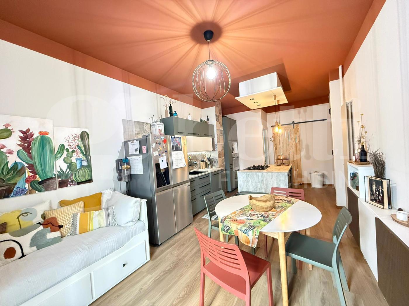 Lingresso conduce a un pratico disimpegno che accompagna alla zona giorno, caratterizzata da un moderno soggiorno con parete cottura a vista e isola allamericana, uno spazio conviviale pensato per la vita quotidiana e per accogliere amici e familiari, da cui si accede al primo balcone.