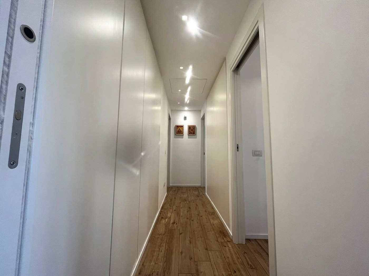 Tra le dotazioni interne figurano porta blindata, infissi in legno con doppio vetro, pavimentazione in gres porcellanato, sistema dallarme, serrande elettriche, armadi a muro su misura, cucina su misura, climatizzazione in tutti gli ambienti abitabili, zona lavanderia a scomparsa con lavatrice e asciugatrice e zanzariere.