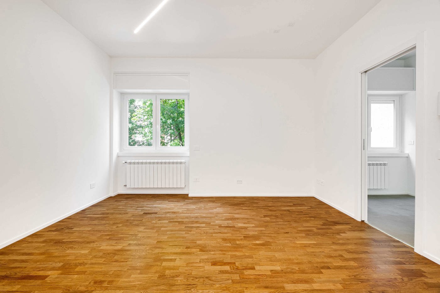 L'appartamento, di circa 75 mq, si presenta con una distribuzione degli spazi razionale e moderna: ingresso su luminoso soggiorno, cucina abitabile separata, disimpegno, bagno finestrato e due camere da letto.