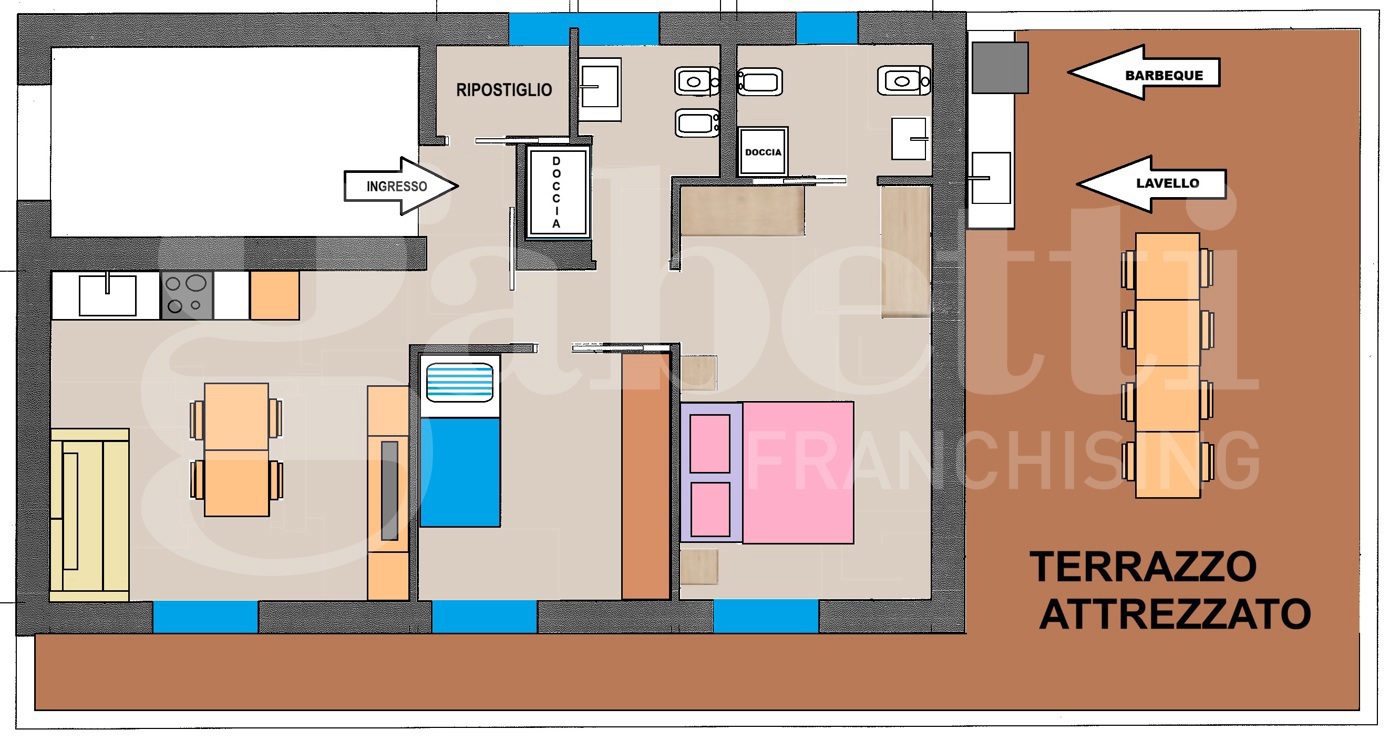 Terrazzo a livello di ca 40 mq attrezzato con barbeque e lavello.