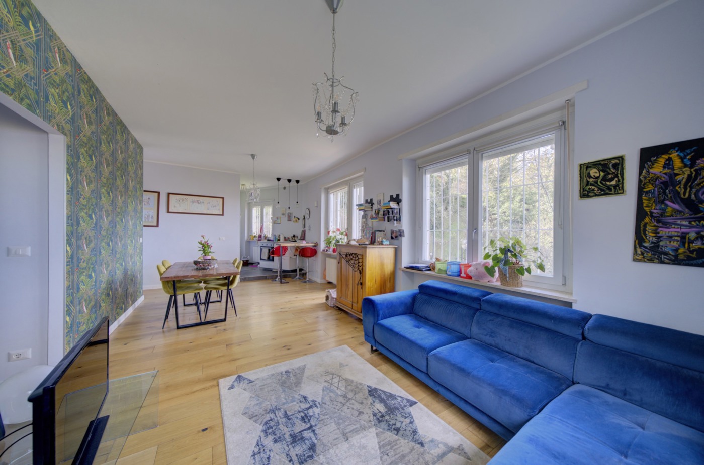 Soggiorno: un ampio ambiente pavimentato con palchetto in grandi listoni caratterizzato da grandi superfici vetrate affacciate sul verde privato.