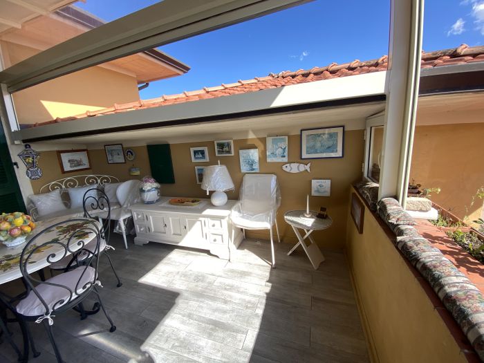 Lappartamento è composto da ingresso in soggiorno con camino, con affaccio su ampia terrazza attrezzata con tende elettriche che permettono la chiusura totale, così da creare un secondo soggiorno, cucina abitabile, camera matrimoniale e bagno.