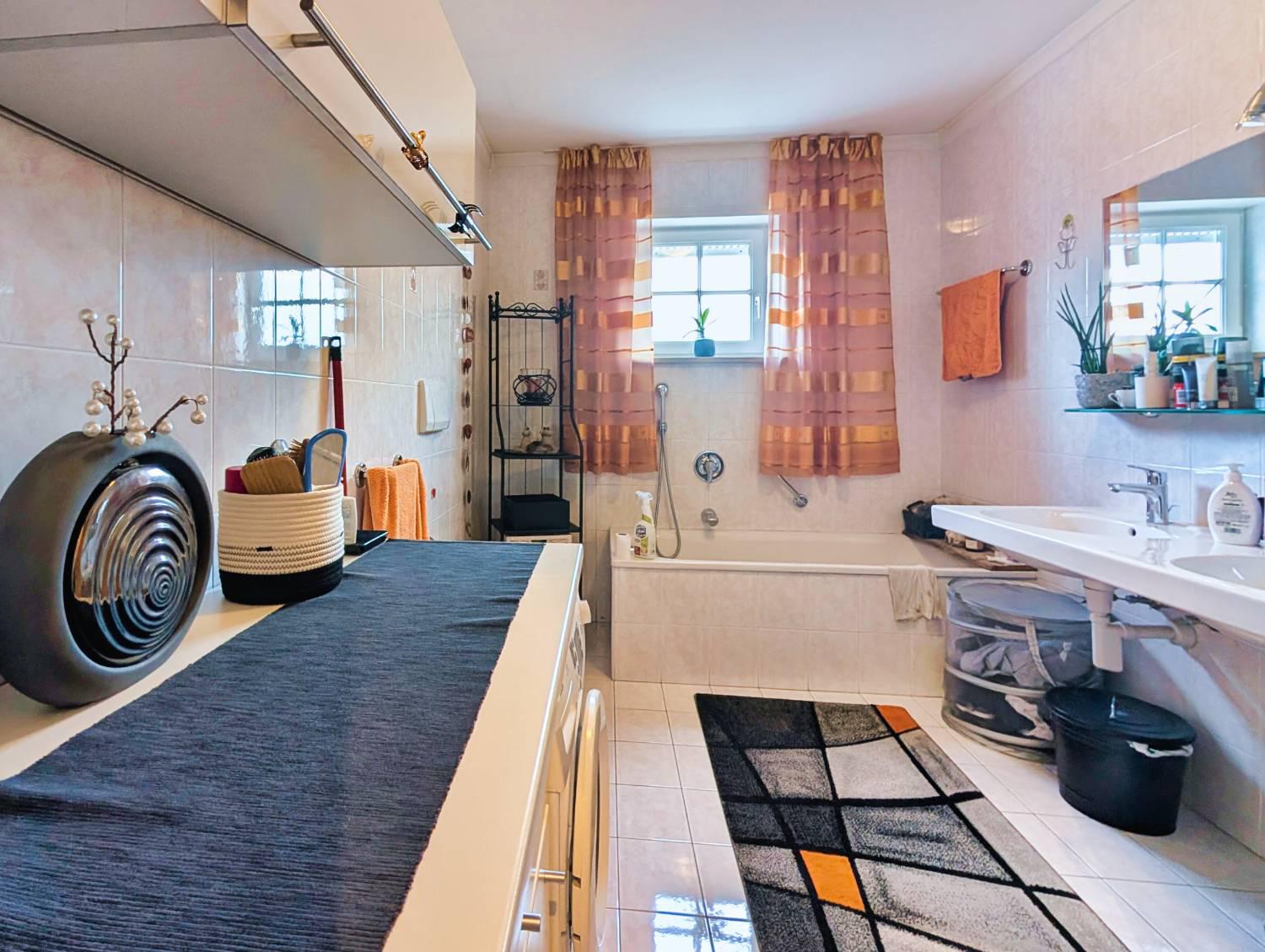 Il bagno, spazioso e luminoso, dotato di finestra, vasca, doccia e attacco lavatrice.