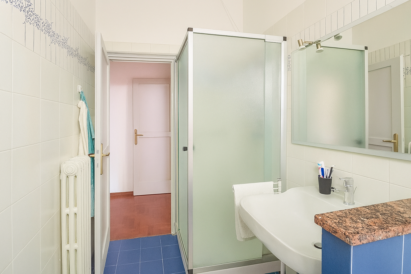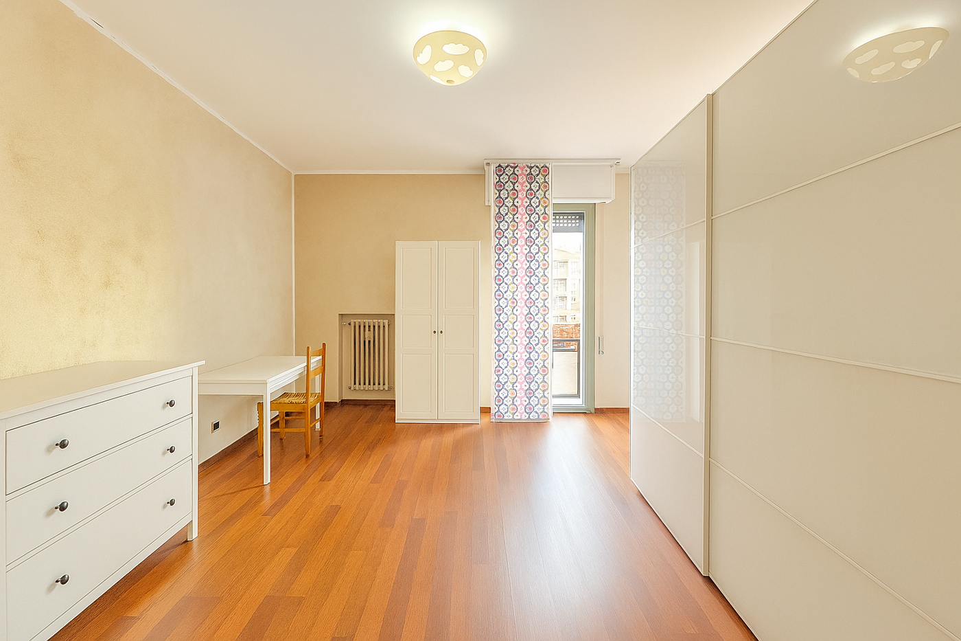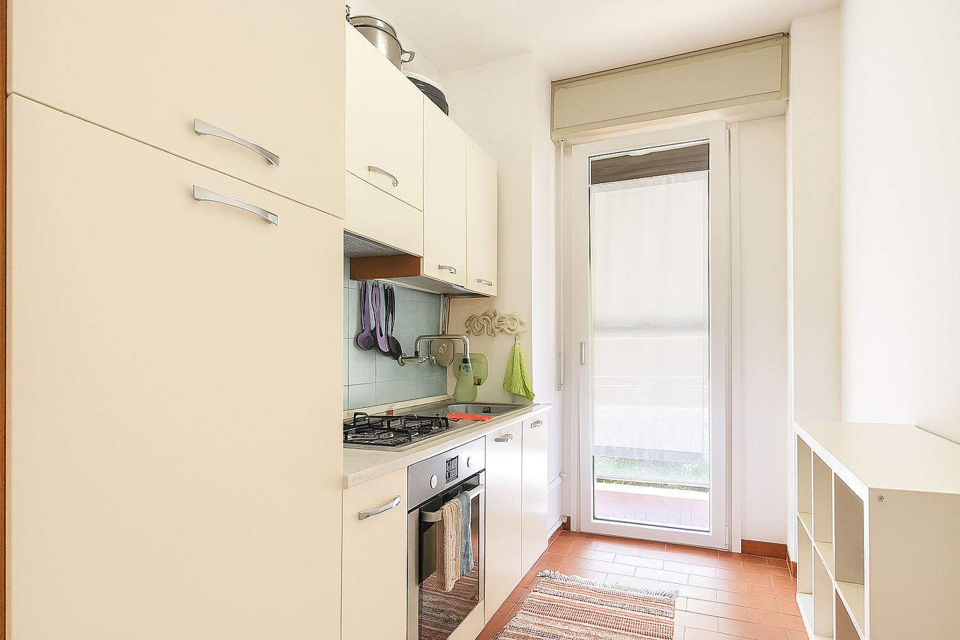 Lappartamento composto da cucina arredata con uscita su balcone di servizio, soggiorno ampio e luminoso, due camere (matrimoniale con cabina armadio e accesso al balcone di servizio; seconda camera comoda per due posti letto), bagno finestrato completo di lavatrice.
