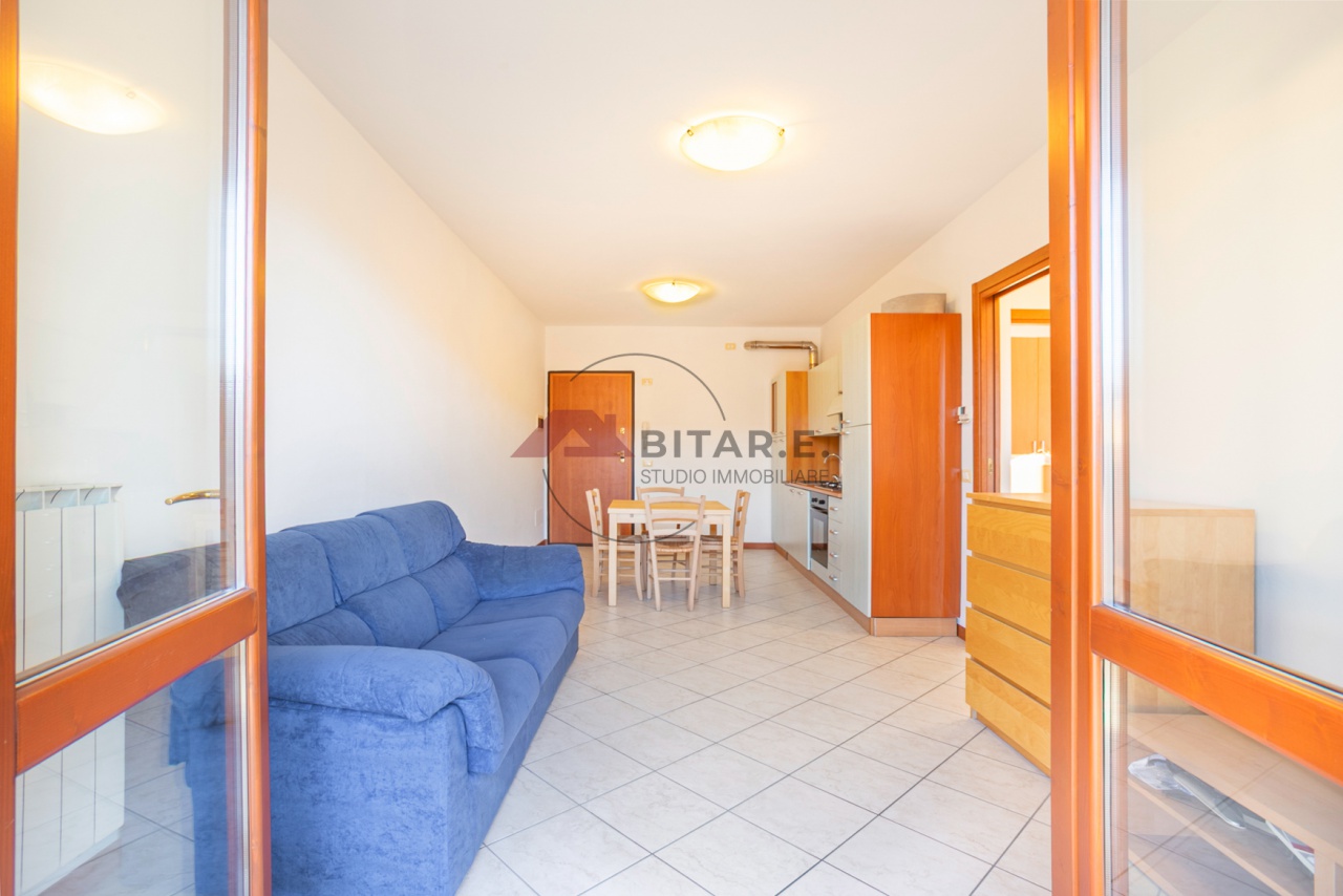 L'appartamento è così distribuito: - Soggiorno con cucina a vista, - accesso diretto al balcone, perfetto come sfogo esterno.