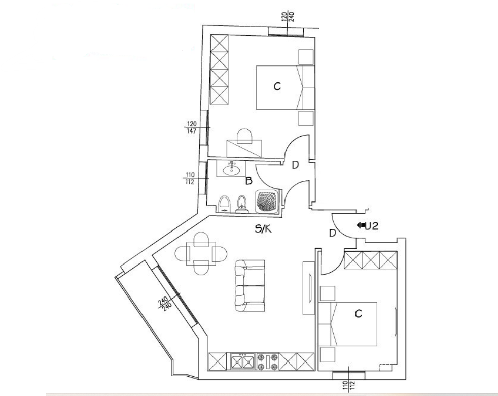 Appartamento trilocale composto da: ingresso su disimpegno, zona giorno con angolo cottura e accesso al balcone, due camere da letto e bagno.