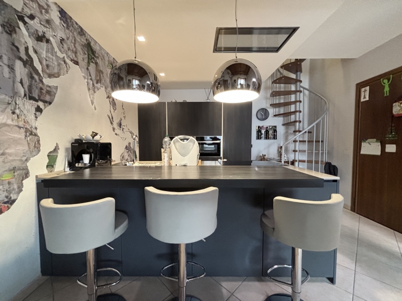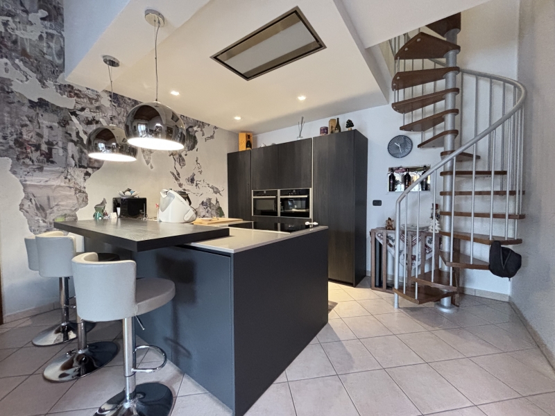 L'arredo cucina di design e fatta su misura con faretti e cappa a soffitto, cabina capiente e piano di lavoro in quarzo compreso nel prezzo come molto altro arredo.