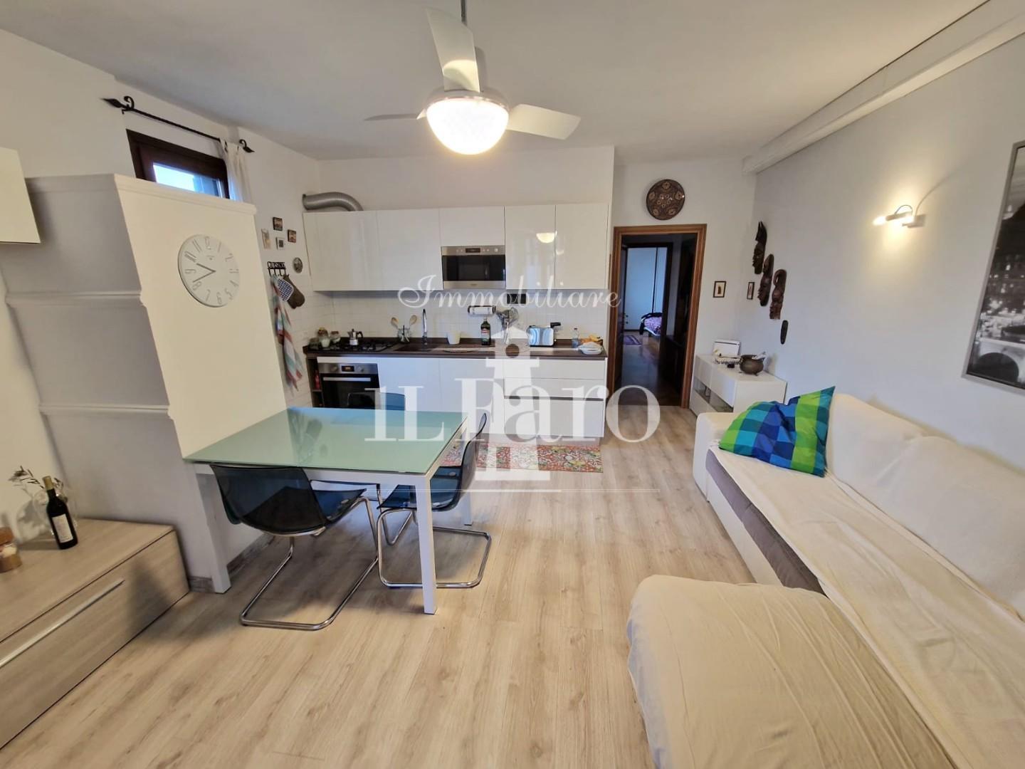 L'abitazione è così composta: entrando ci accoglie un' ampia zona giorno con angolo cottura ed accesso diretto alla terrazza coperta che avvolge su due lati l'appartamento munita di comodi attacchi lavanderia, proseguendo tramite un disimpegno raggiungiamo le due camere da letto di cui una matrimoniale e l'altra singola, ed il bagno non finestrato con vasca.