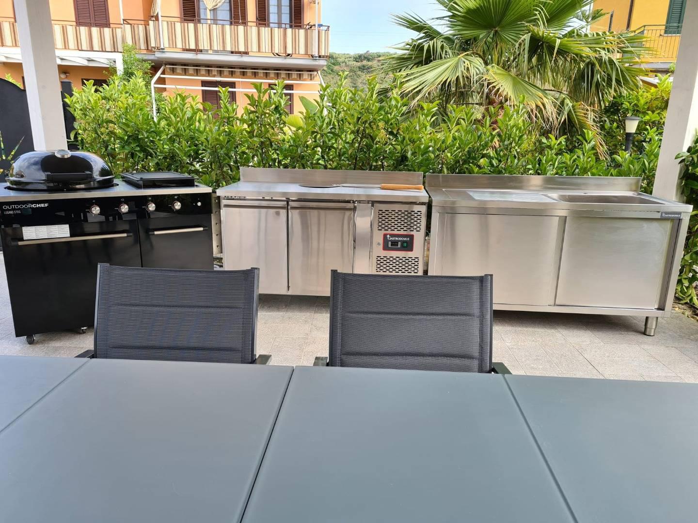 L'ampia corte esterna, circondata dal verde, il luogo ideale per trascorrere serate indimenticabili con amici e familiari, grazie ai porticati e al barbecue a disposizione.