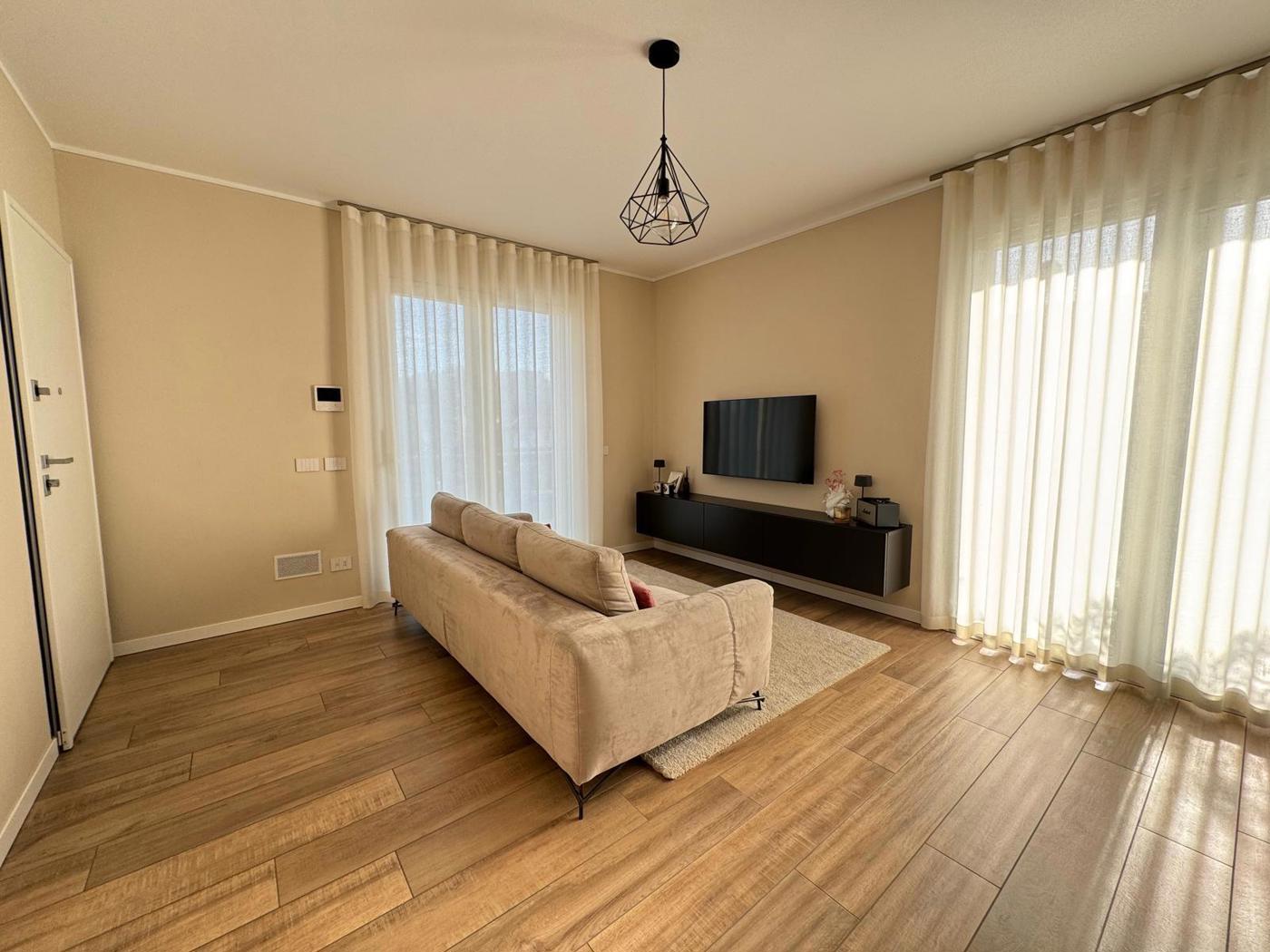 L'appartamento, di recentissima costruzione del 2022 e con classe energetica A4, si estende su una superficie di 100 mq COMMERCIALI ed composto da un ingresso nella zona living, un disimpegno, due bagni di cui uno adibito a lavanderia, una camera matrimoniale e una camera singola.