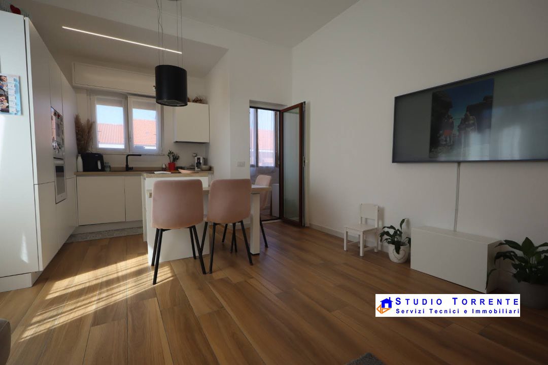 L'appartamento è composto da ampio ingresso, soggiorno con cucina a vista con penisola moderna, balcone con zona lavanderia e attacchi lavatrice, bagno con doccia, cameretta, camera matrimoniale.