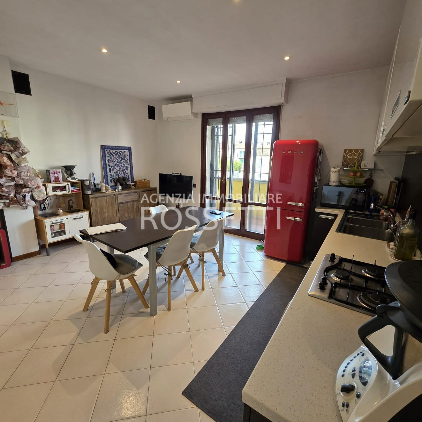Ingresso dal disimpegno su soggiorno-pranzo con angolo cottura e balcone, cameretta con porta-finestra di accesso sul balcone, camera matrimoniale con balcone e bagno con finestra, vasca e doccia.