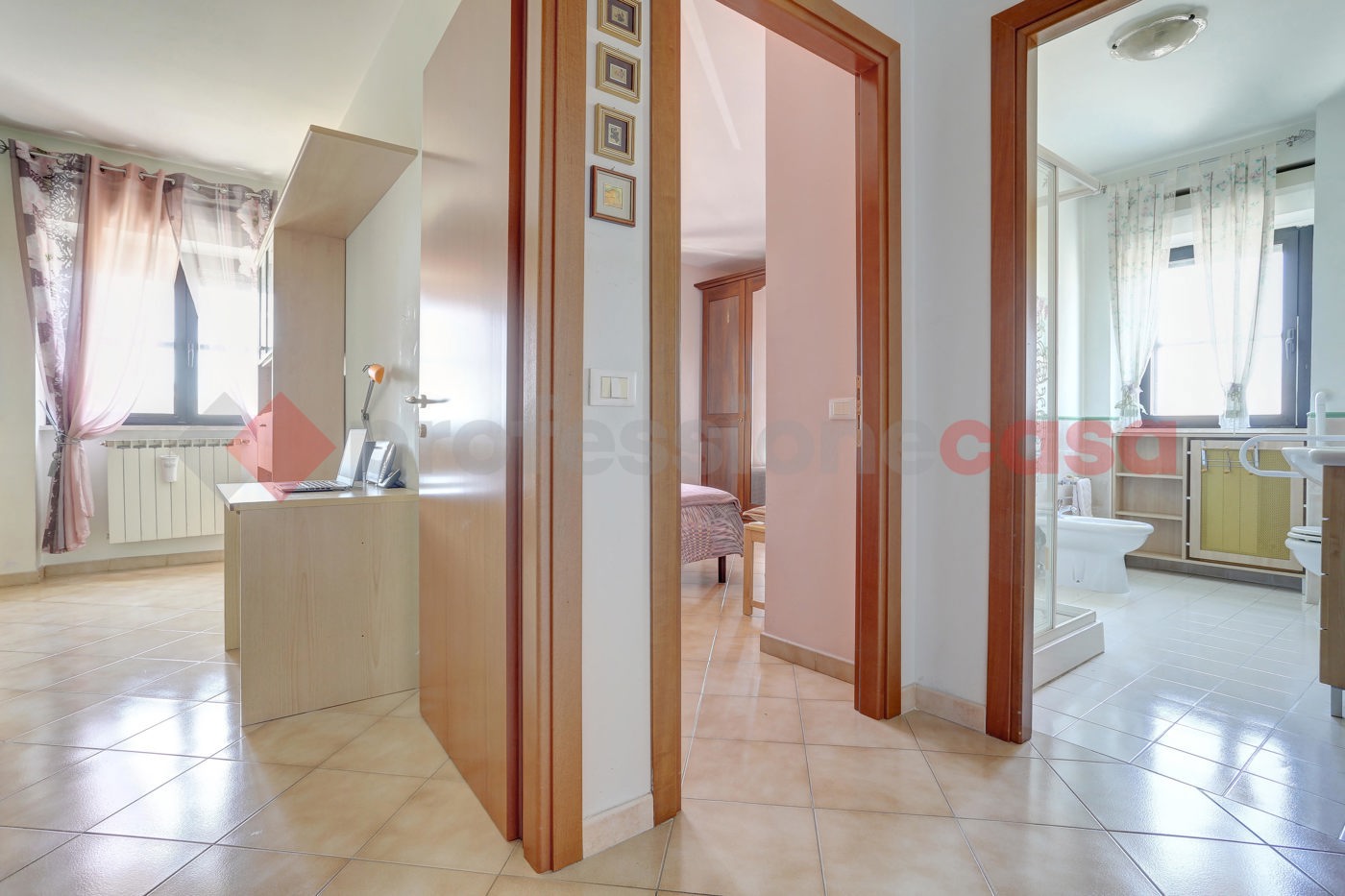 La zona notte, composta da un disimpegno che conduce a due camere da letto, con possibilit di realizzare una terza camera, e a due bagni entrambi finestrati.