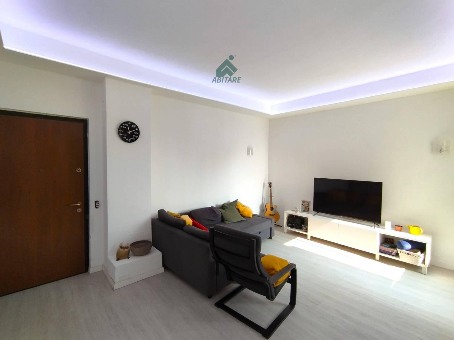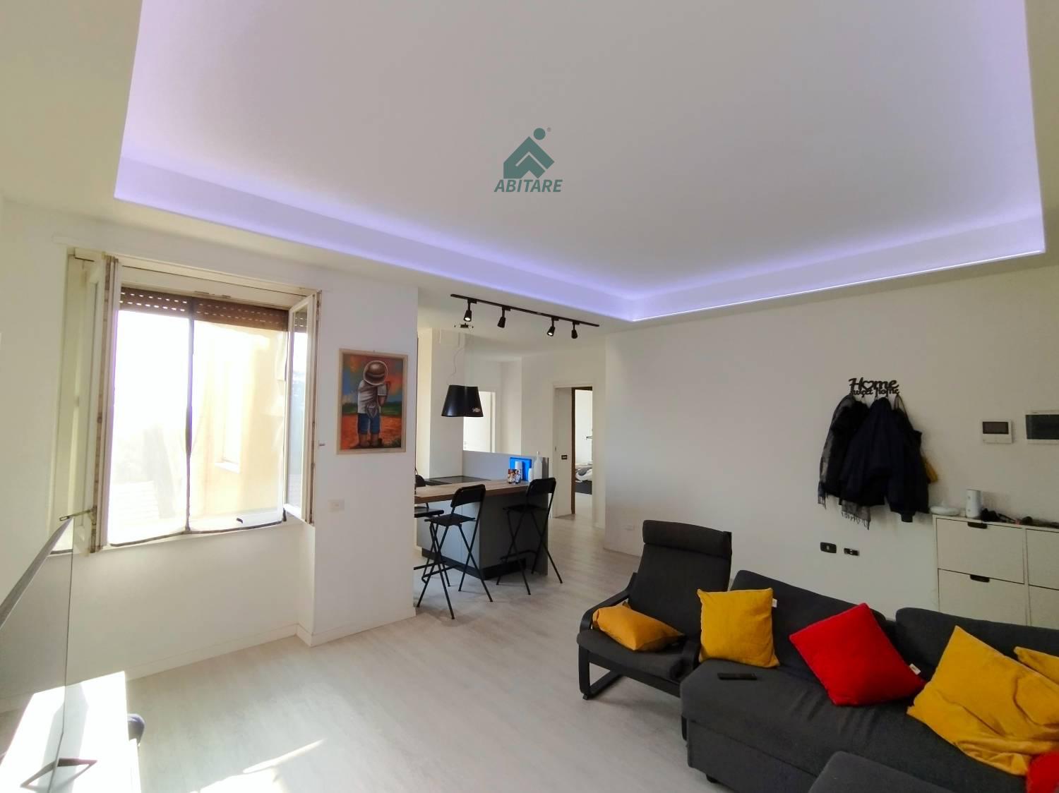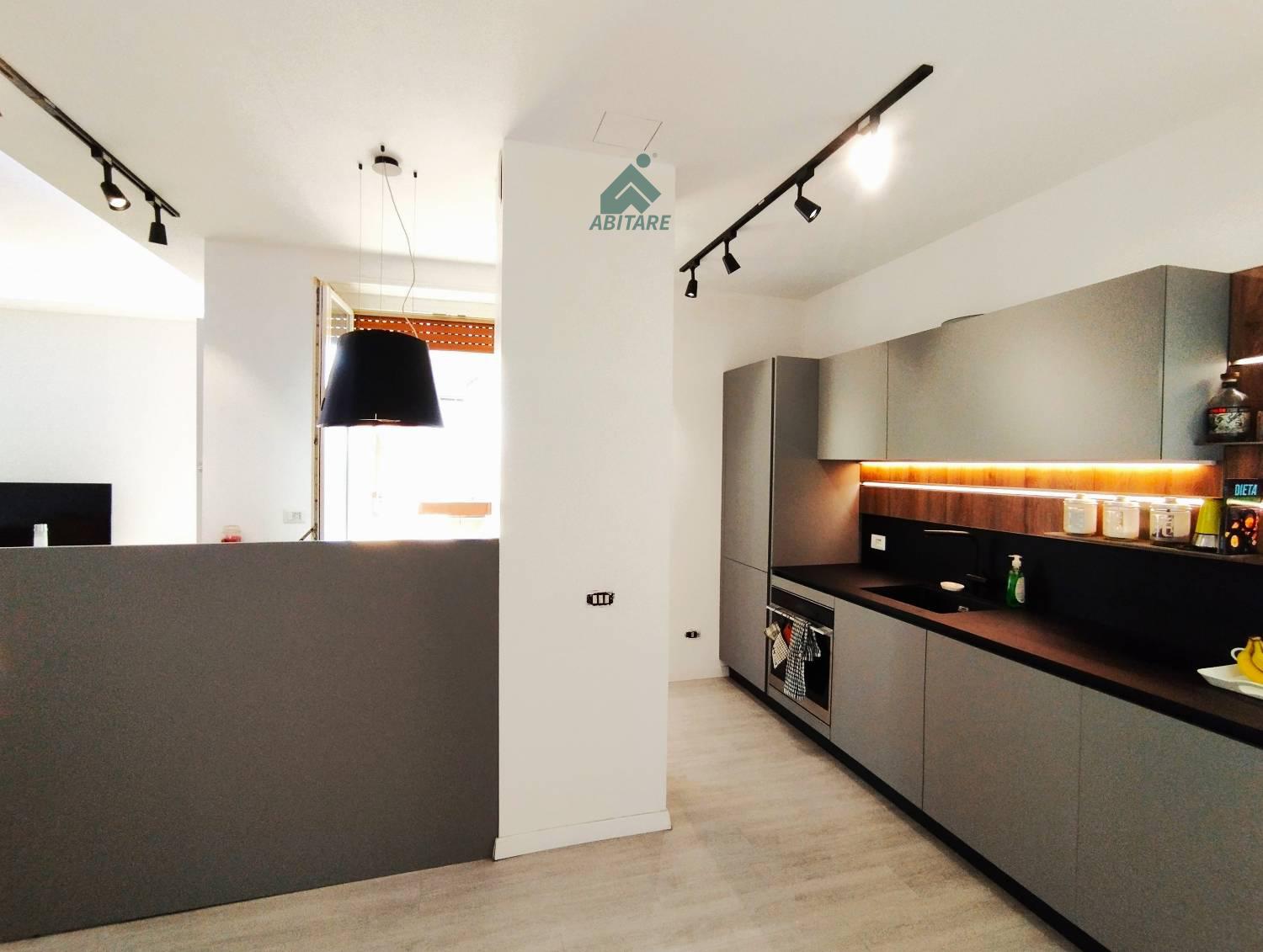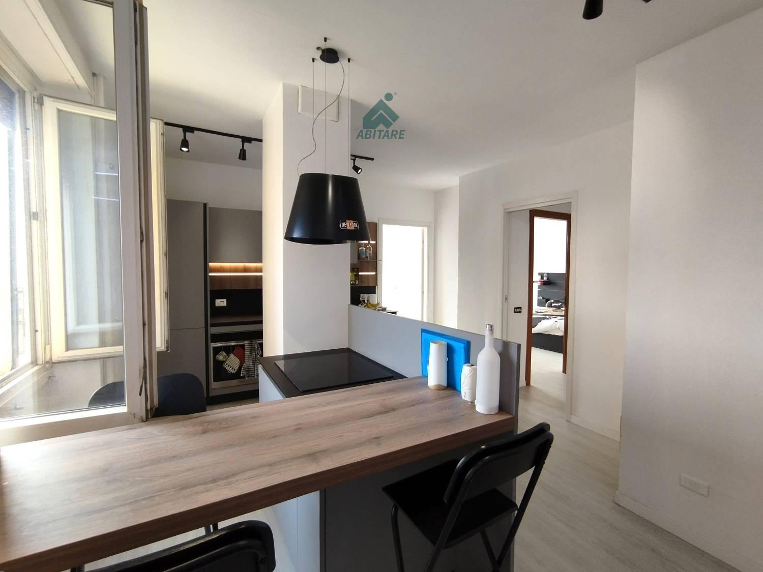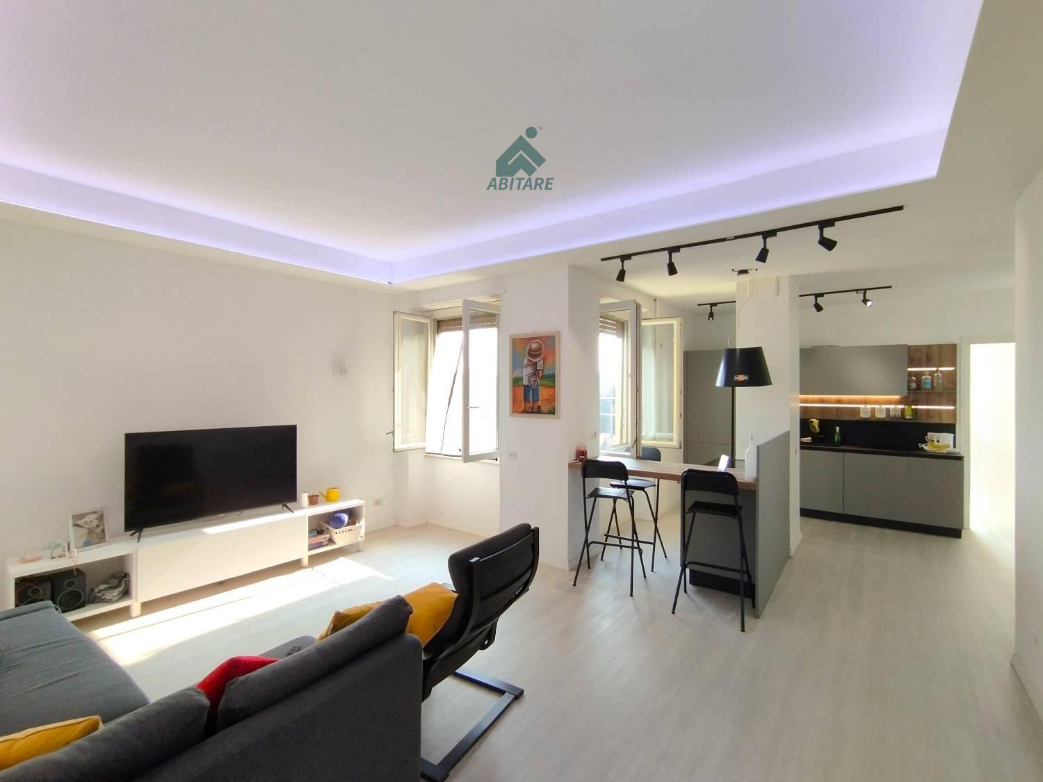 Al terzo piano con ascensore nuovo, la casa si apre su un soggiorno con cucina a vista di ampiezza inaspettata: la luce entra da ben due punti, riempiendo gli ambienti di unatmosfera pulita e contemporanea.