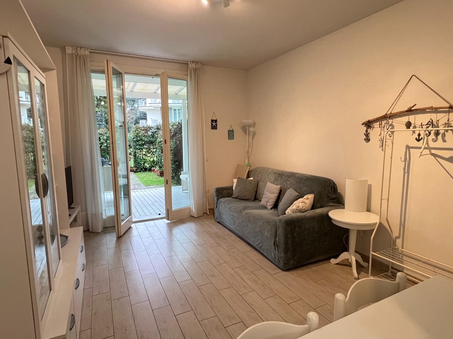 Ingresso su Soggiorno Open Space con Angolo Cottura e Accesso al Giardino Privato, Camera Matrimoniale, Cameretta, Bagno con Doccia.