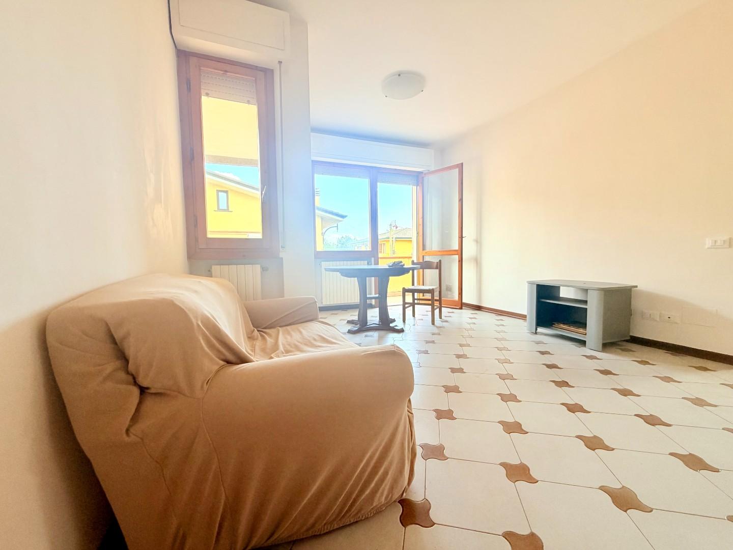 Lingresso conduce a un luminoso soggiorno, ben distribuito e collegato alla cucina separata in stile cucinotto.
