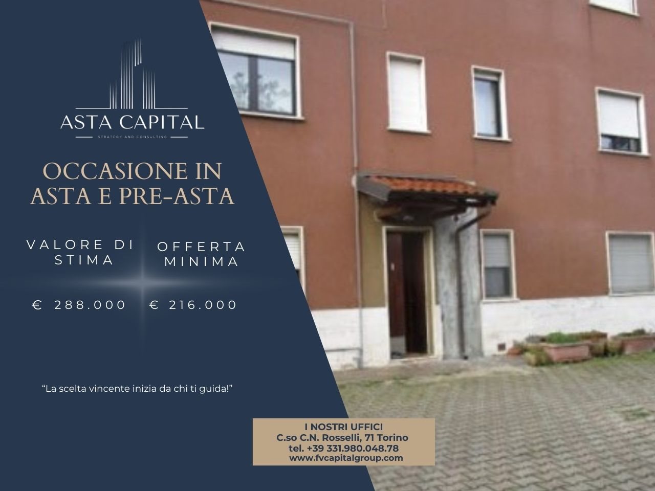 Ogni immobile viene analizzato a fondo: verifichiamo la documentazione legale, studiamo la perizia per evitare sorprese e prepariamo business plan personalizzati per chi cerca un and #8217;opportunit and #224; di ***.*******.** possibile, esploriamo strade alternative all and #8217;asta, come il saldo e stralcio, che permette and #8211; in determinati casi and #8211; di ottenere l and #8217;immobile prima che vada all and #8217;asta, con condizioni potenzialmente ancora pi and #249; ***.*******.** noi non sei mai solo: offriamo assistenza dedicata 24 ore su 24, sempre pronti a rispondere ai tuoi dubbi e guidarti con ***.*******.** anche orgogliosi del nostro dipartimento Eticapital, dedicato a sostenere le famiglie in difficolt and #224; economica, aiutandole a salvare la propria casa prima che venga pignorata o messa all and #8217;***.*******.**, grazie alla preparazione del nostro team, collaboriamo anche con istituti di credito per accedere a NPL (crediti deteriorati con sottostante immobiliare), offrendo cos and #236; opportunit and #224; uniche anche a investitori e operatori del ***.*******.** Asta Capital, ogni asta and #232; un percorso sicuro, chiaro ed ***.*******.** per una consulenza gratuita e senza impegno.