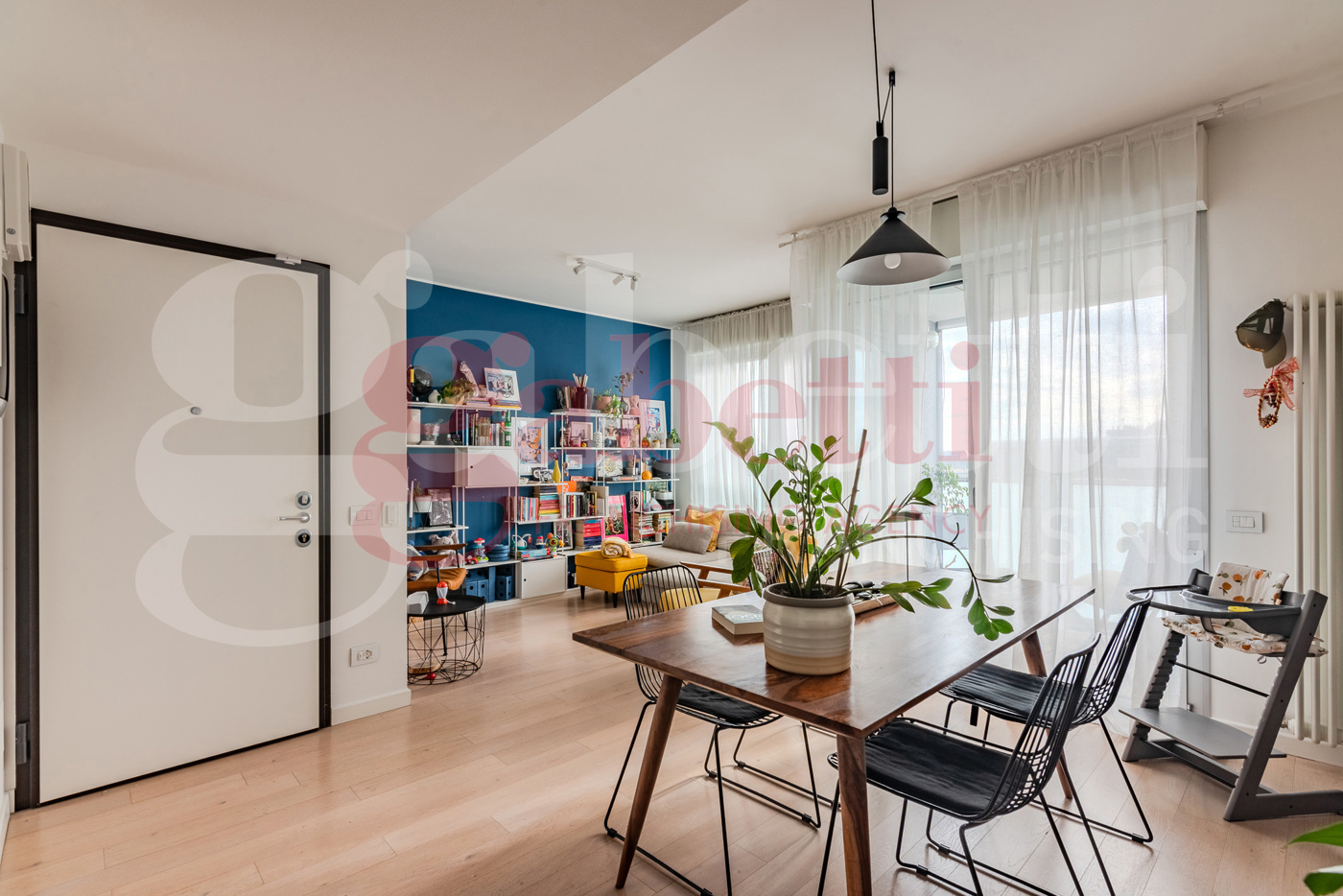 Gli spazi interni sono ben distribuiti, il soggiorno offre accesso al primo terrazzino luminoso e con vista aperta e una scaffalatura interna.
