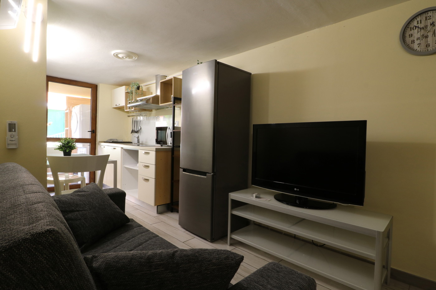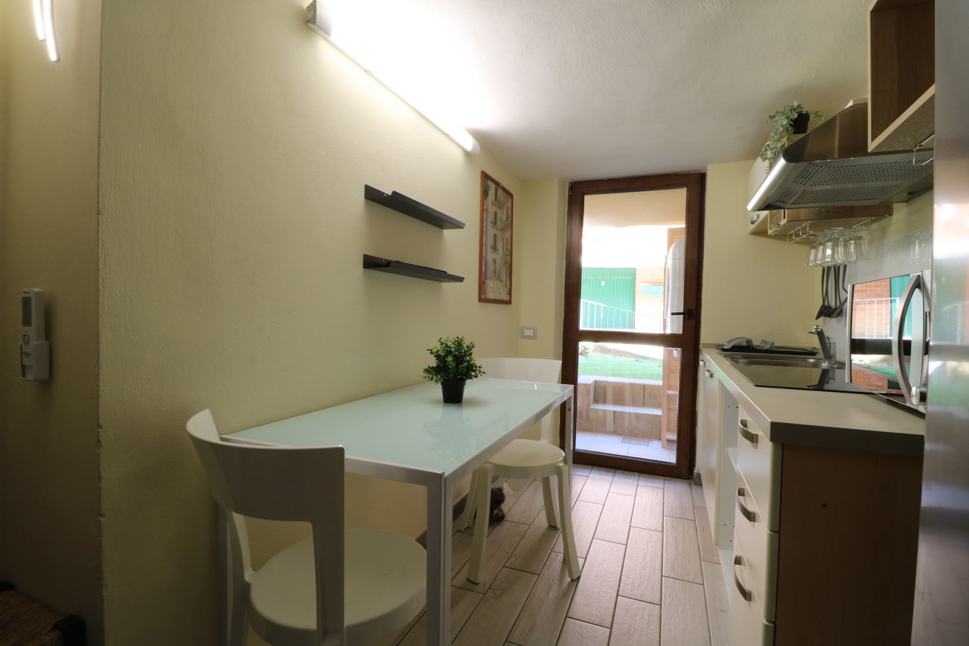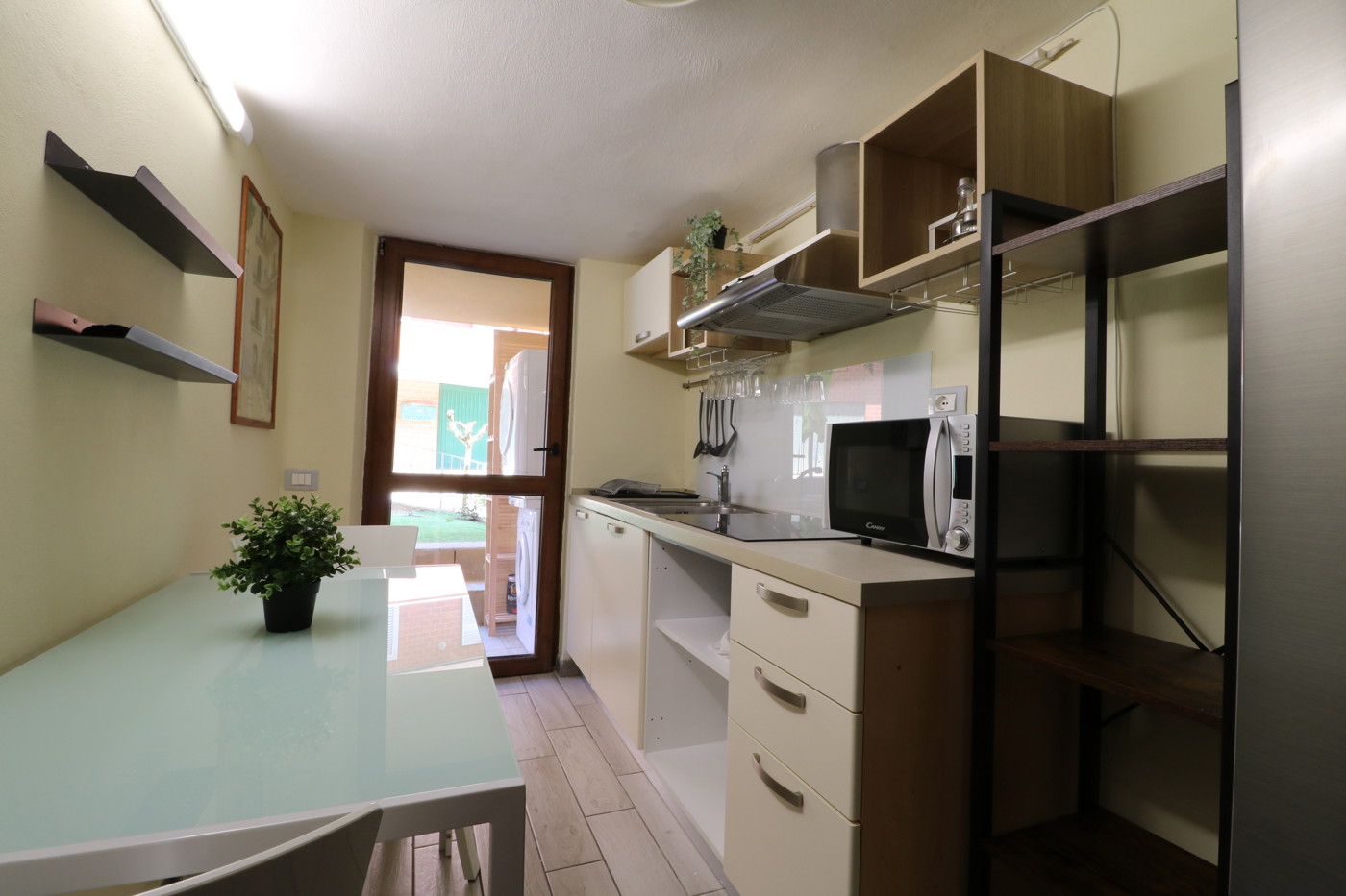 l'appartamento dotato di una cucina, di una camera singola e di una camera matrimoniale che hanno tutte accesso diretto al giardino tramite portafinestra, il bagno completo, con doccia e aspiratore.