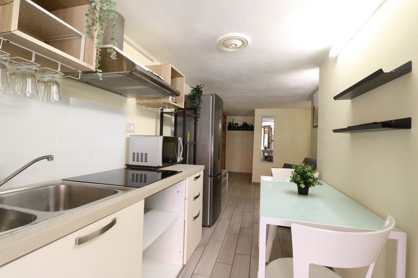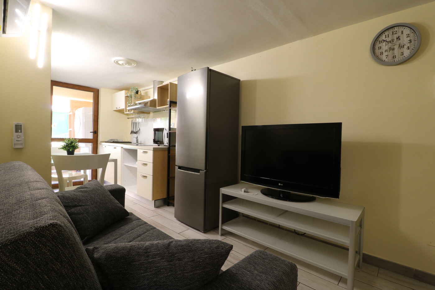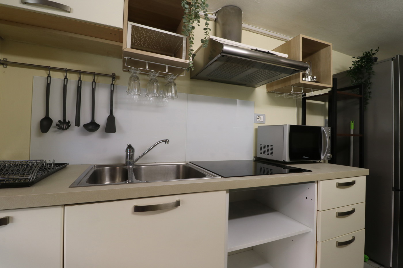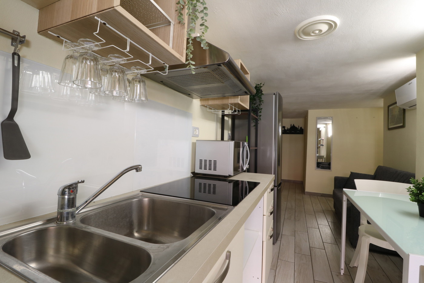 l'appartamento dotato di una cucina, di una camera singola e di una camera matrimoniale che hanno tutte accesso diretto al giardino tramite portafinestra, il bagno completo, con doccia e aspiratore.