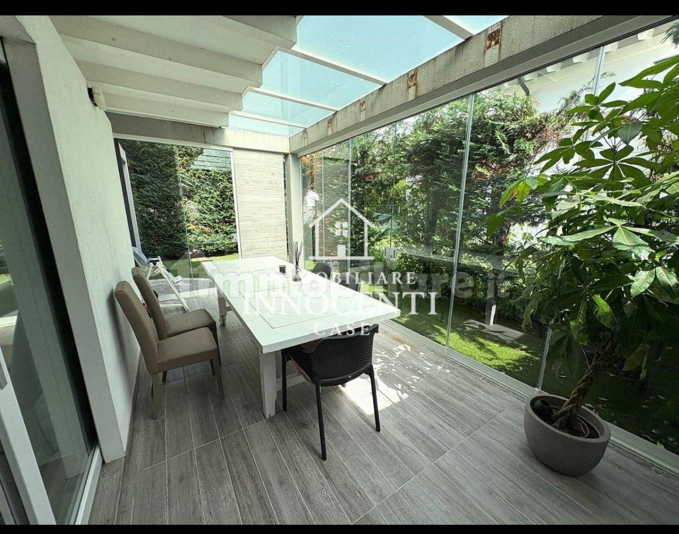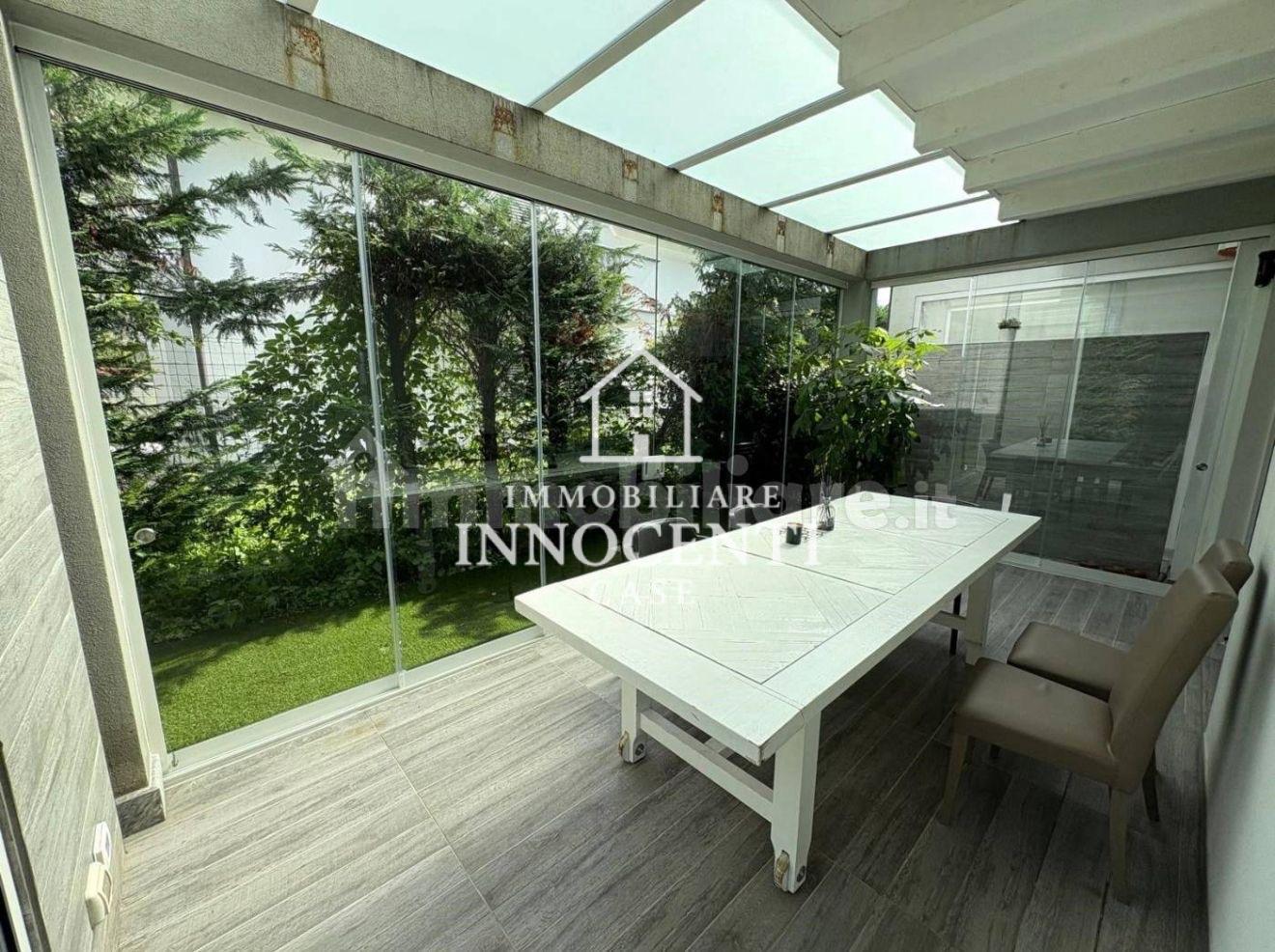 Lingresso introduce in un ampio soggiorno con zona pranzo, luminoso e ben proporzionato, dove la grande portafinestra permette di accedere a una splendida veranda coperta, ideale per pranzare allaperto o rilassarsi durante le giornate estive.