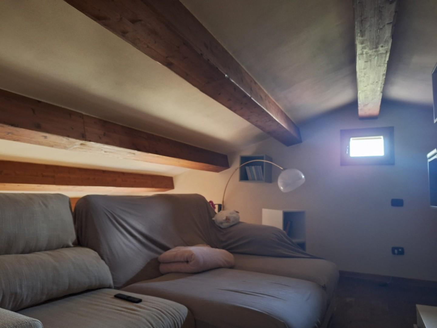L'appartamento è composto da zona giorno con caminetto, un soppalco accessibile da scala in legno ( dove troviamo un altro locale ), disimpegno notte, camera e bagno.