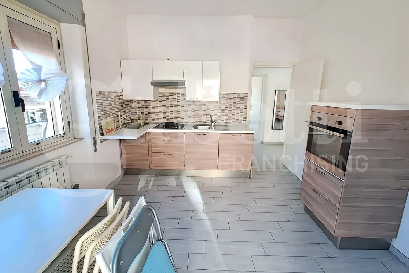 L'abitazione composta da soggiorno, cucina abitabile, due camere matrimoniali, un bagno finestrato ed un comodo balcone ad angolo.