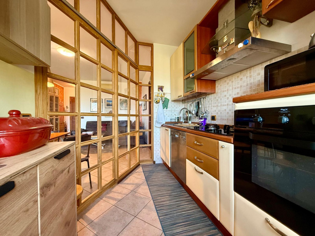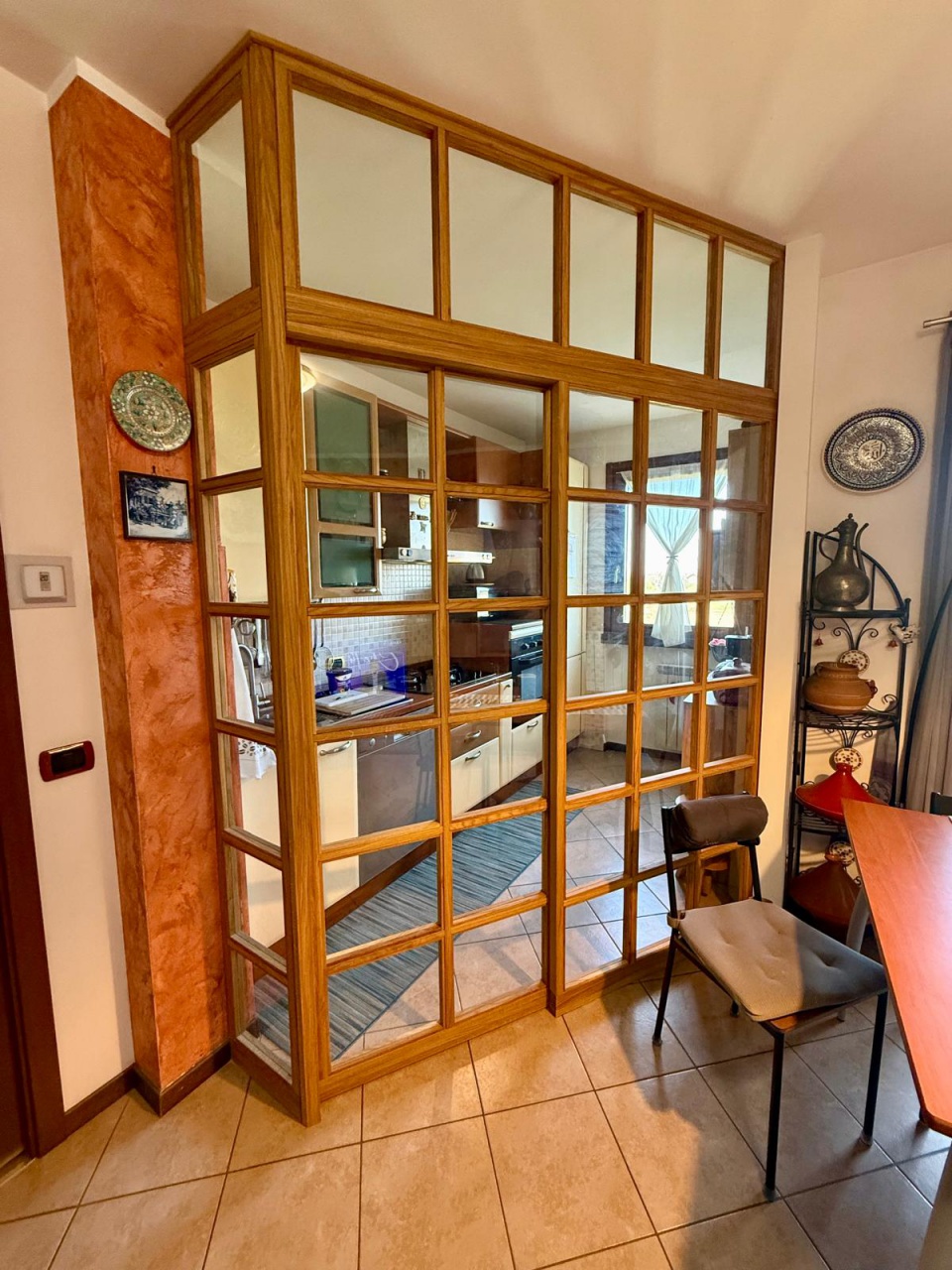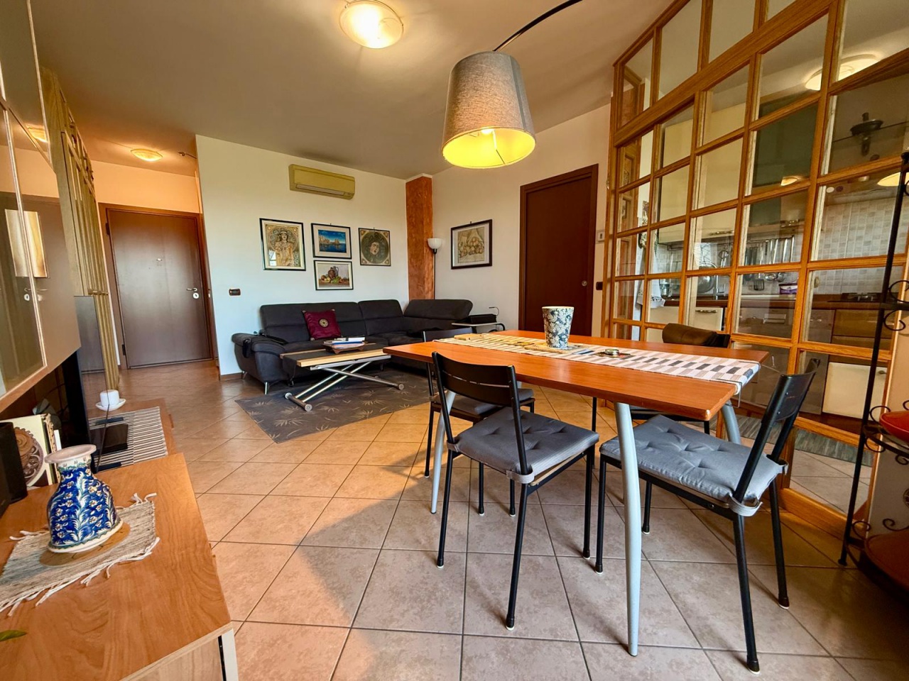 L'appartamento versa in ottime condizioni, pavimentazione con piastrelle in gress porcellanato posate con fuga stretta, porta blindata, serramenti e porte interne in legno, doppi vetri, zanzariere, porte interne a battente, particolare parete in vetro e legno a separare cucina e sala, pavimentazione nella zonsa notte in parquet , cantina piastrellata.