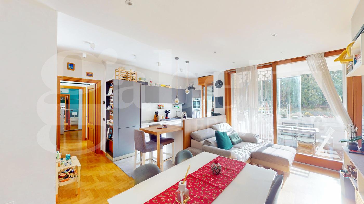 Gli Interni Lappartamento, rifinito con estrema cura e materiali di pregio, si apre su un luminoso soggiorno con cucina a vista.