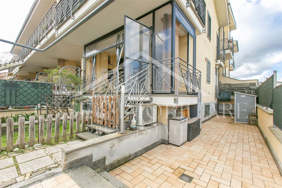 Ha una doppia esposizione angolare, che ne garantisce una massima luminosità.\nDal vialetto pedonale su Valle Muricana, si arriva al cancello privato che da accesso diretto allo spazio esterno/giardino, da qui salendo qualche gradino si arriva all'ingresso principale con porta blindata, preceduta da un portico con tenda pvc amovibile che rende fruibile il portico anche in inverno.\nIl trilocale ha un salone con cucina a vista, due bagni e due camere oltre ad un gradevole spazio esterno, composto da un comodo portico ed un giardinetto parte pavimentato e parte a verde.\nLa casa internamente è organizzata in ogni minimo dettaglio, per avere il massimo confort.\nIl riscaldamento è autonomo a metano, finestre con infissi in legno e doppi vetri, grate, zanzariere, persiane blindate, condizionatori d'aria DAIKIN, caldaia nuova, pannelli solari per l'acqua calda, allarme.\nCompleta la proprietà un posto auto coperto di 13mq in autorimessa condominiale, ubicato nella via posteriore ossia Via Visano.\nLe presenti informazioni e planimetrie sono meramente indicative e non costituiscono elementi contrattuali.\nPer info e appuntamento contattare il 0689935159; 3517728727.