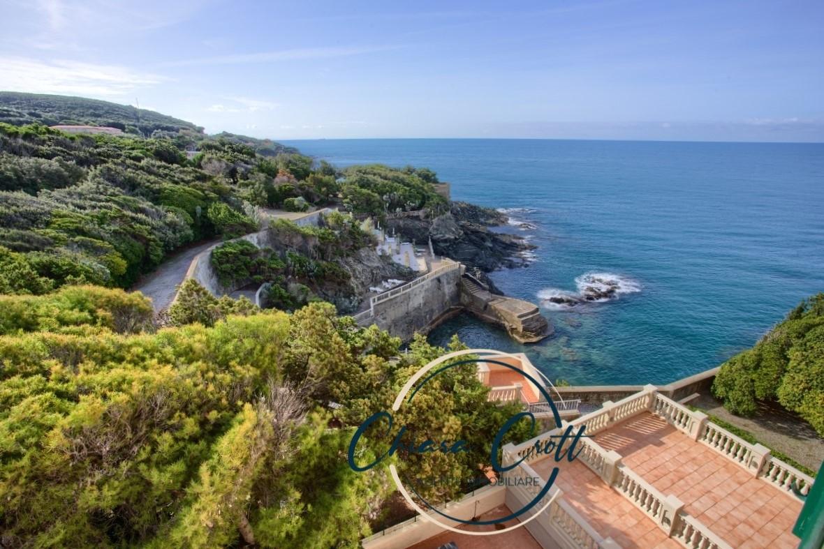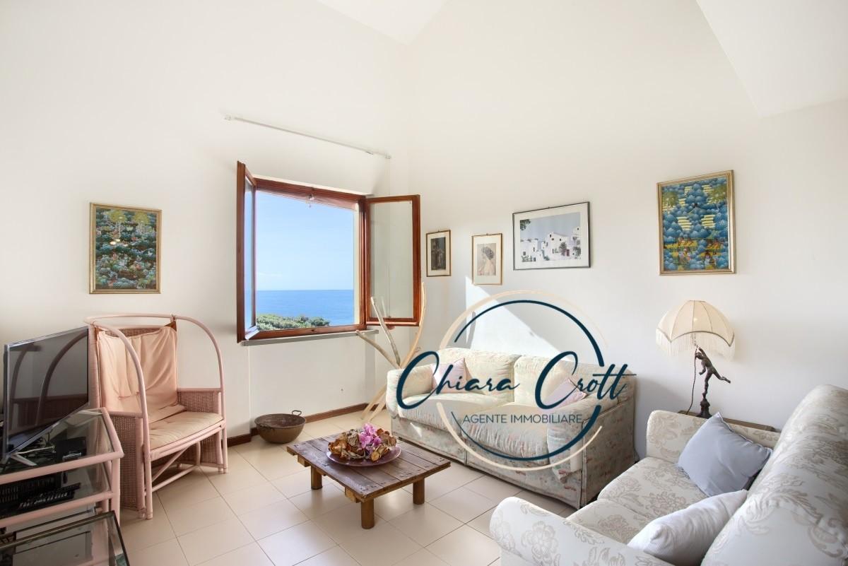 Il soggiorno si estende poi in un salottino con soffitto alto 4,30 metri, caratterizzato da due ampie finestre di cui una offre una vista mozzafiato sul mare, la scogliera e la rigogliosa vegetazione circostante.