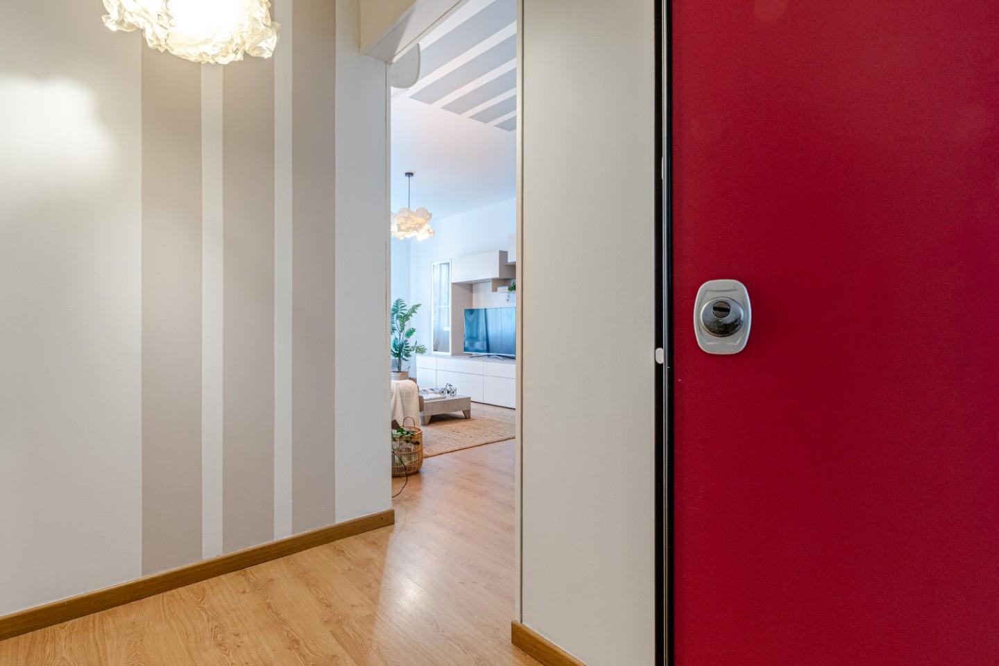 Apri la porta blindata e varchi la soglia, entri nel disimpegno, lo spazio perfetto per un appendiabiti o una piccola consolle dingresso.