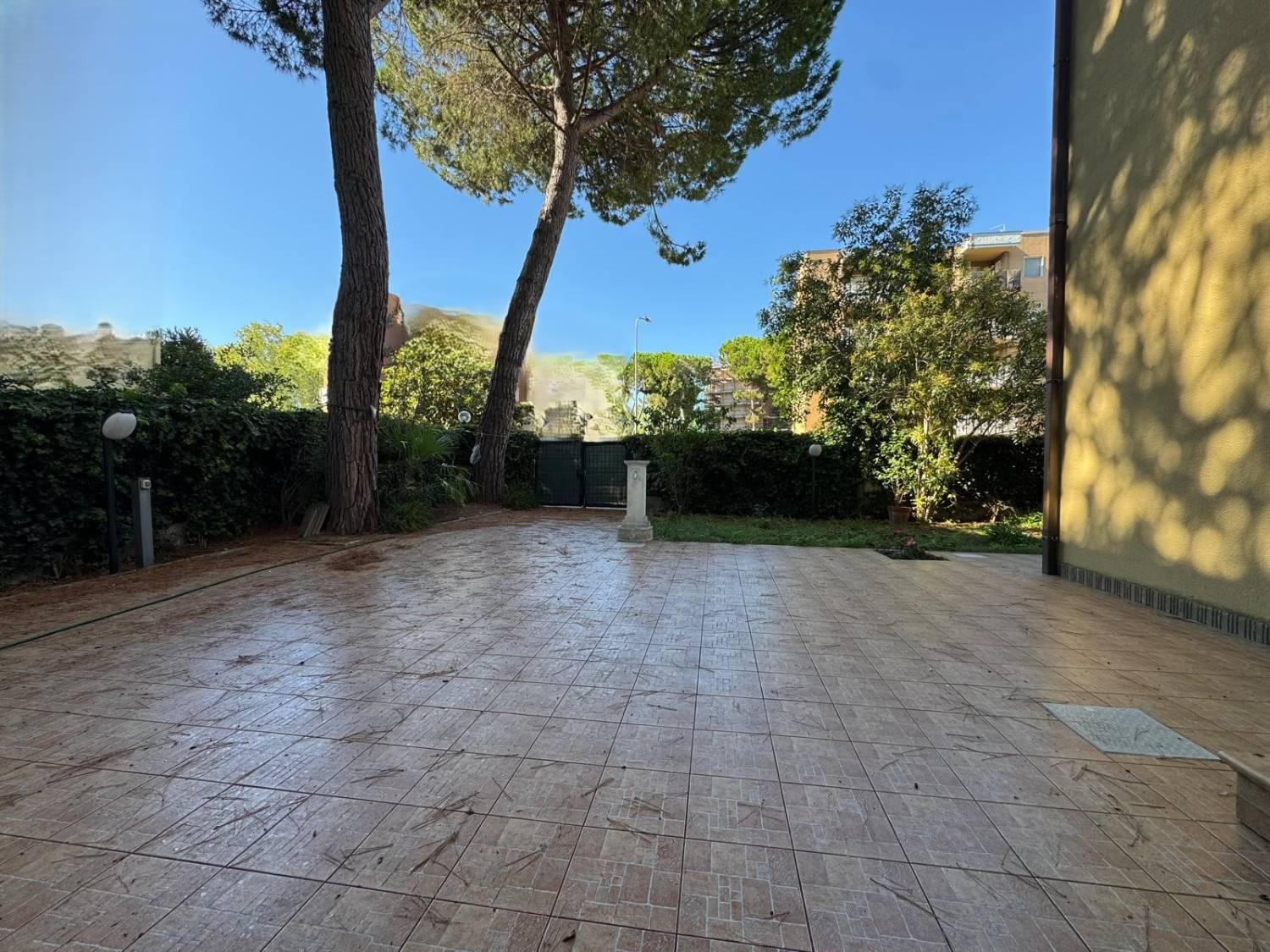 Dal soggiorno, tramite una porta finestra, si accede al grande giardino privato pavimentato.