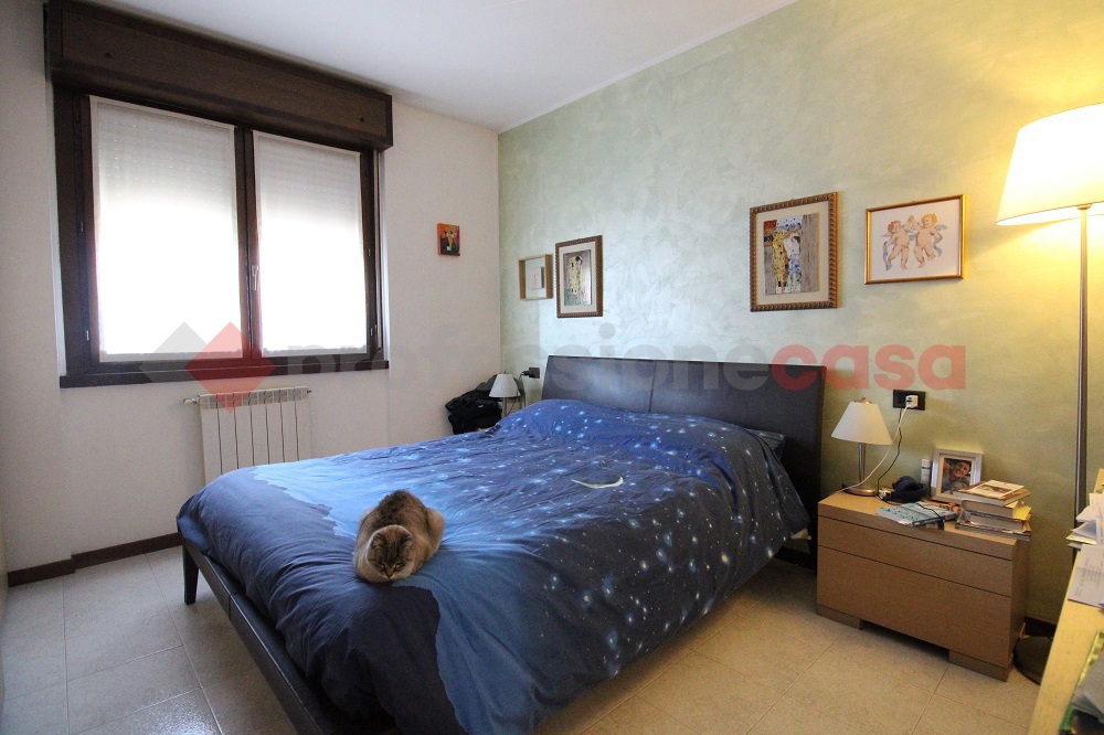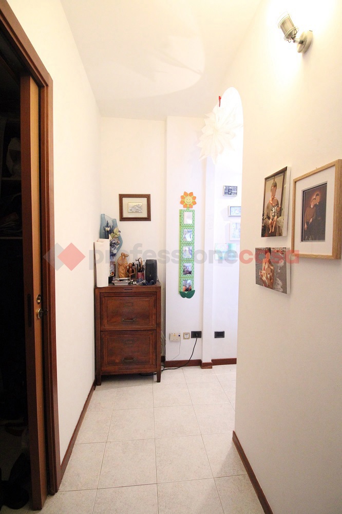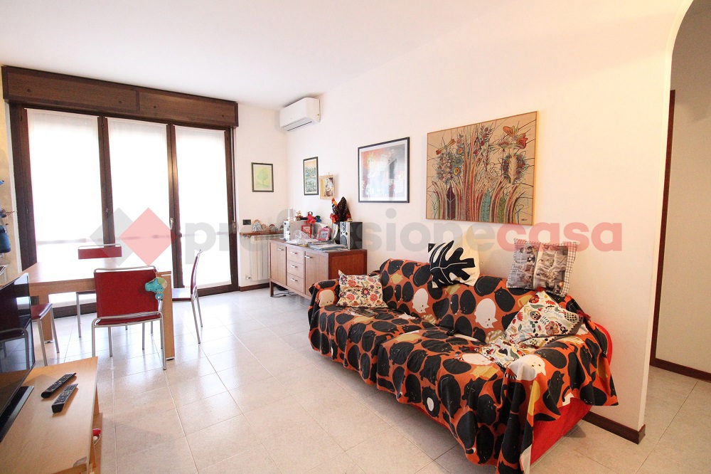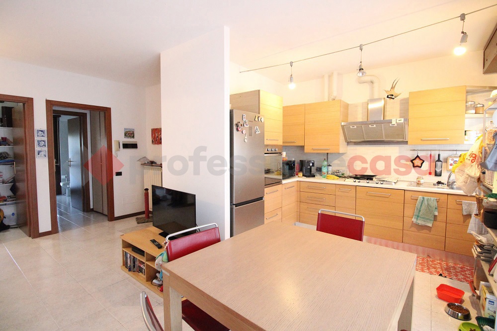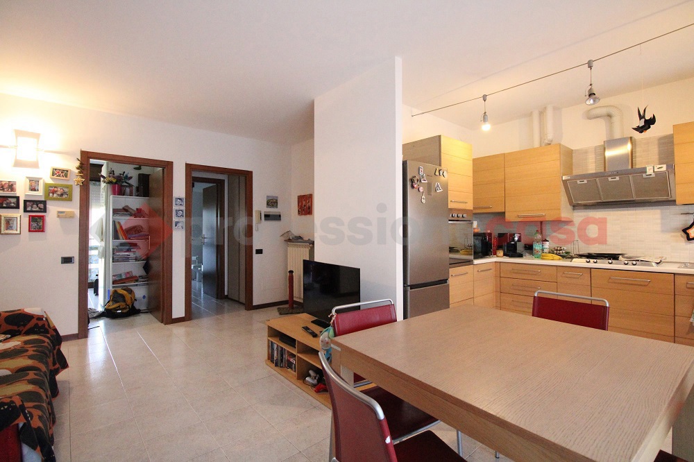 Vaprio d'Adda, in palazzina di met anni '90, tre locali con cantina e box. Composizione: ingresso, soggiorno con cucina a vista e balcone, disimpegno, camera matrimoniale, seconda camera da letto, antibagno (con attacco lavatrice),bagno e pratico ripostiglio.